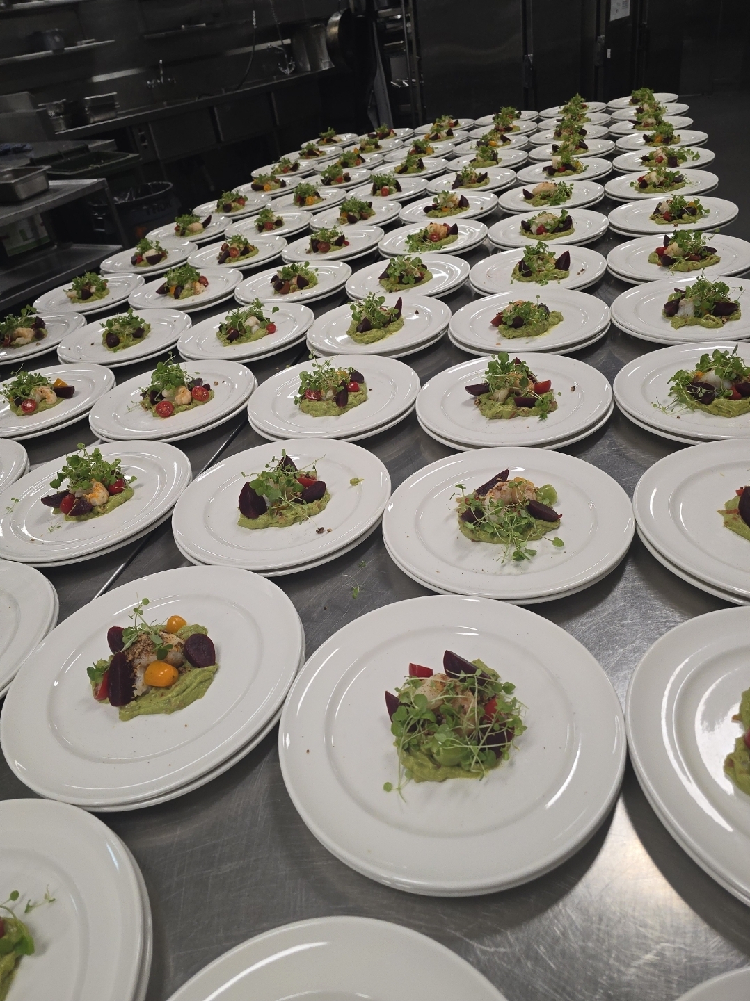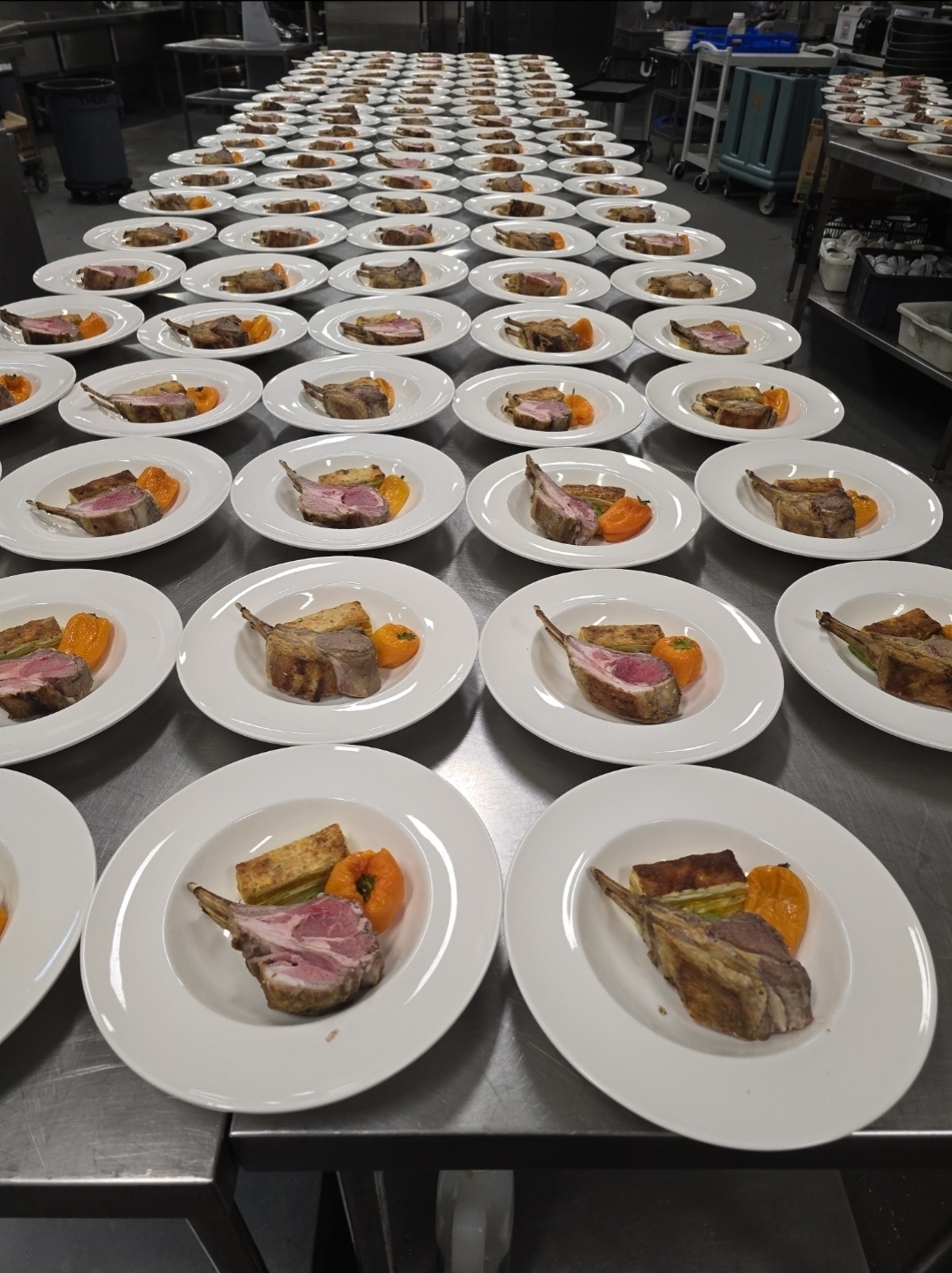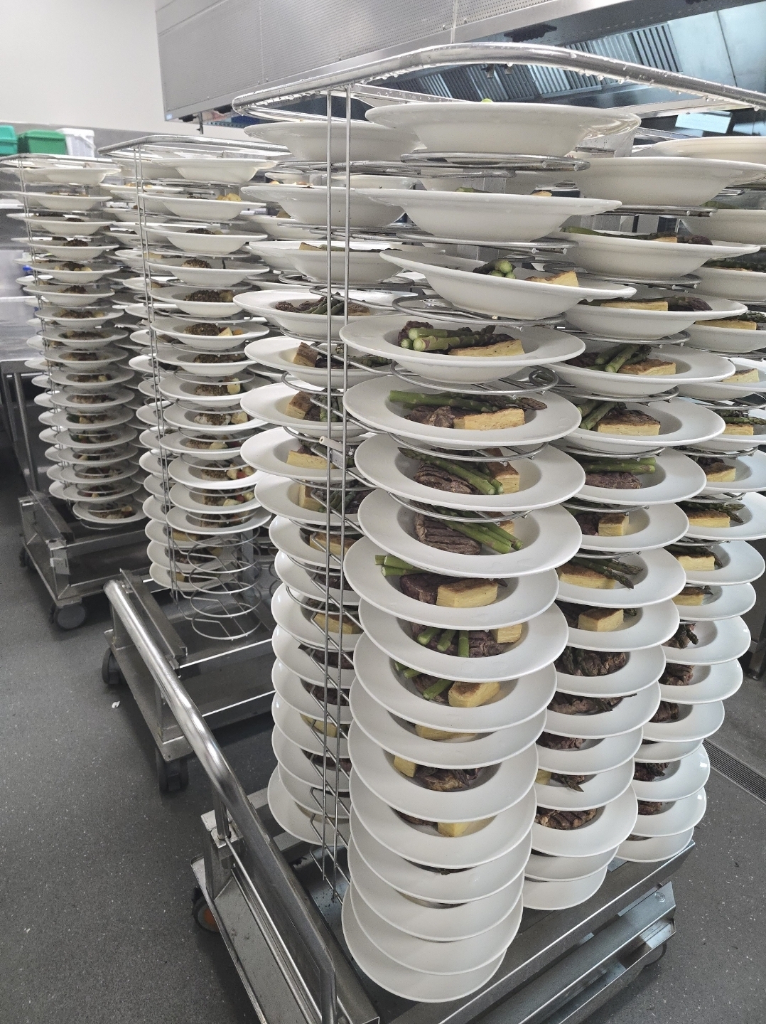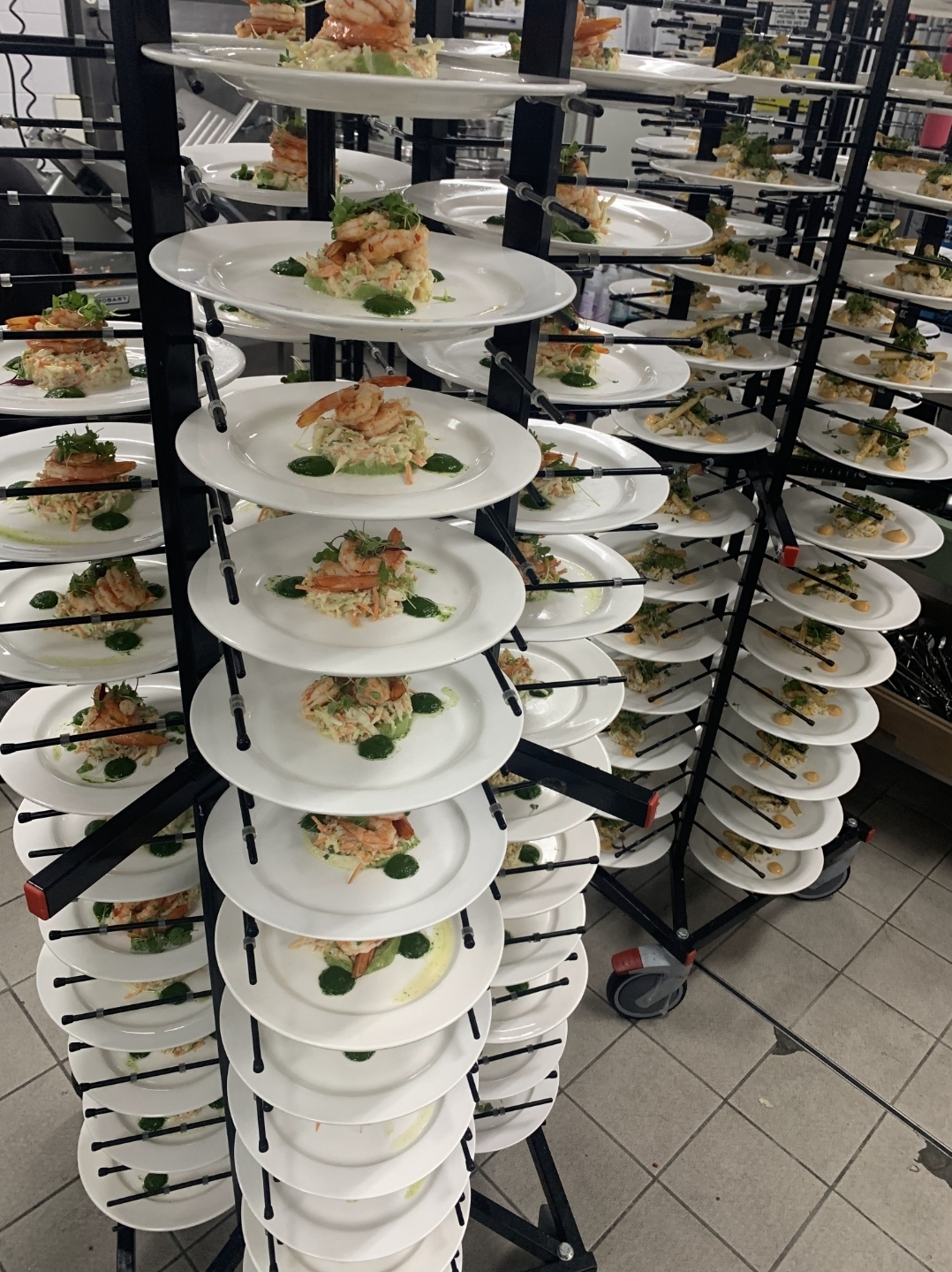 하루 전부터 플레이팅 시작합니다. 접시에 기본 구성(샐러드, 단백질 등)을 완성하고, jack stand(랙 형태 이동식 선반, 80-100개 접시 보관 가능)에 차곡차곡 넣어 냉장 보관합니다.