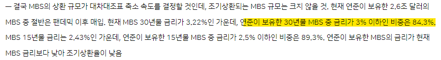 6월 양적 긴축이 시작되기전에 나온 리포트이니 양적 긴축을 하면 MBS를 매각할거라고 생각한듯합니다. 실상은 매각하지 않았지요. 그래서 시장은 긴축을 안하나보다 생각한듯하고 그래서 주식이나 코인이 오른듯합니다.
