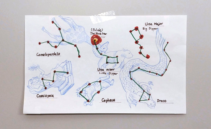 그 외에 기린자리(Camelopardalis), 카시오페아(Cassiopeia), 세페우스(Cepheus), 용자리(Draco) 별자리 모양은 어떤지 탐구하고 그려보는 시간을 가졌답니다.