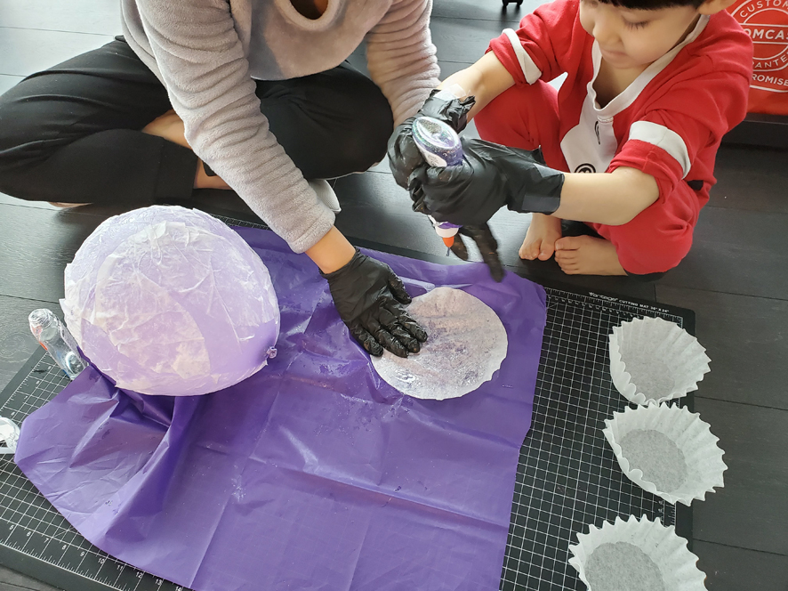물풀이 다 마르면 풍선을 터트려 꺼내주시고 표면이 닿는 부분은 반듯하게 잘라주세요.