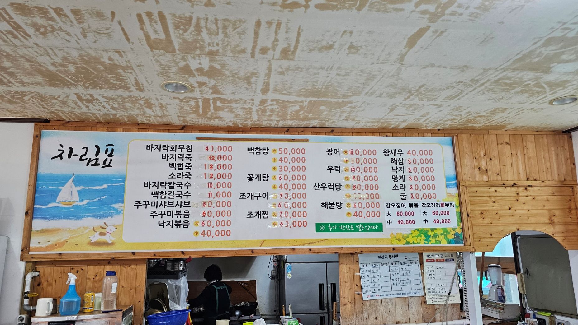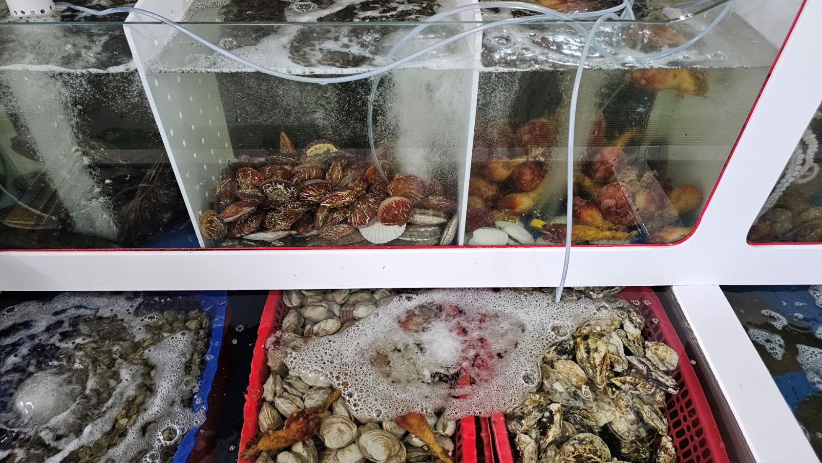 작은 수족관에 다양한 조개류가 있습니다. 봄철에는 낙지와 쭈꾸미가 나오지만 지금은 가격이 비싸 패스했습니다.