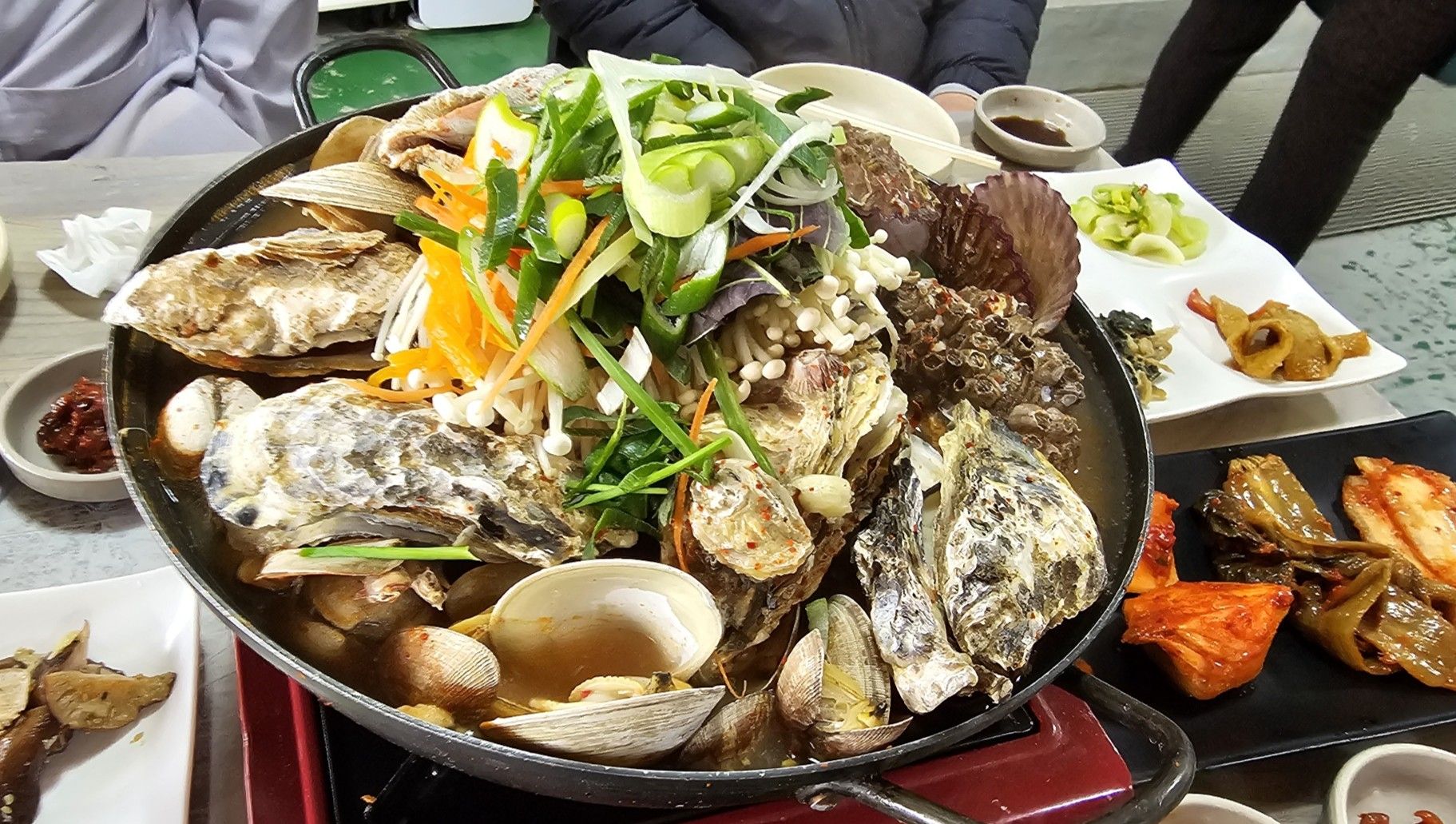 식사하려고 주문한 해물탕인데 여기도 석화가 가득합니다. 각종 해물이 고루 들어 있는데 큼직한 꽃게도 바닥에 들어 잇습니다.