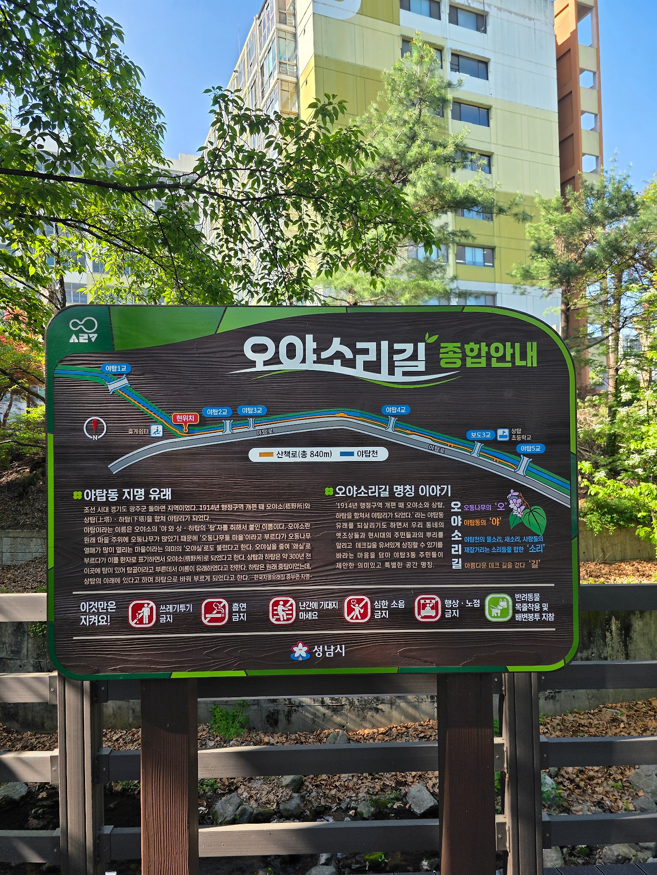 그렇게 걷다가 반갑게 만난 길이 오야소리길이었습니다. 처음에는 아파트 단지 옆 작은 산책로 정도로만 생각했습니다. 그런데 안내판을 보니 약 840m 규모의 생활형 산책로로 정리되어 있었고, 야탑천 물길과 함께 이어지는 걷기 좋은 길이었습니다.