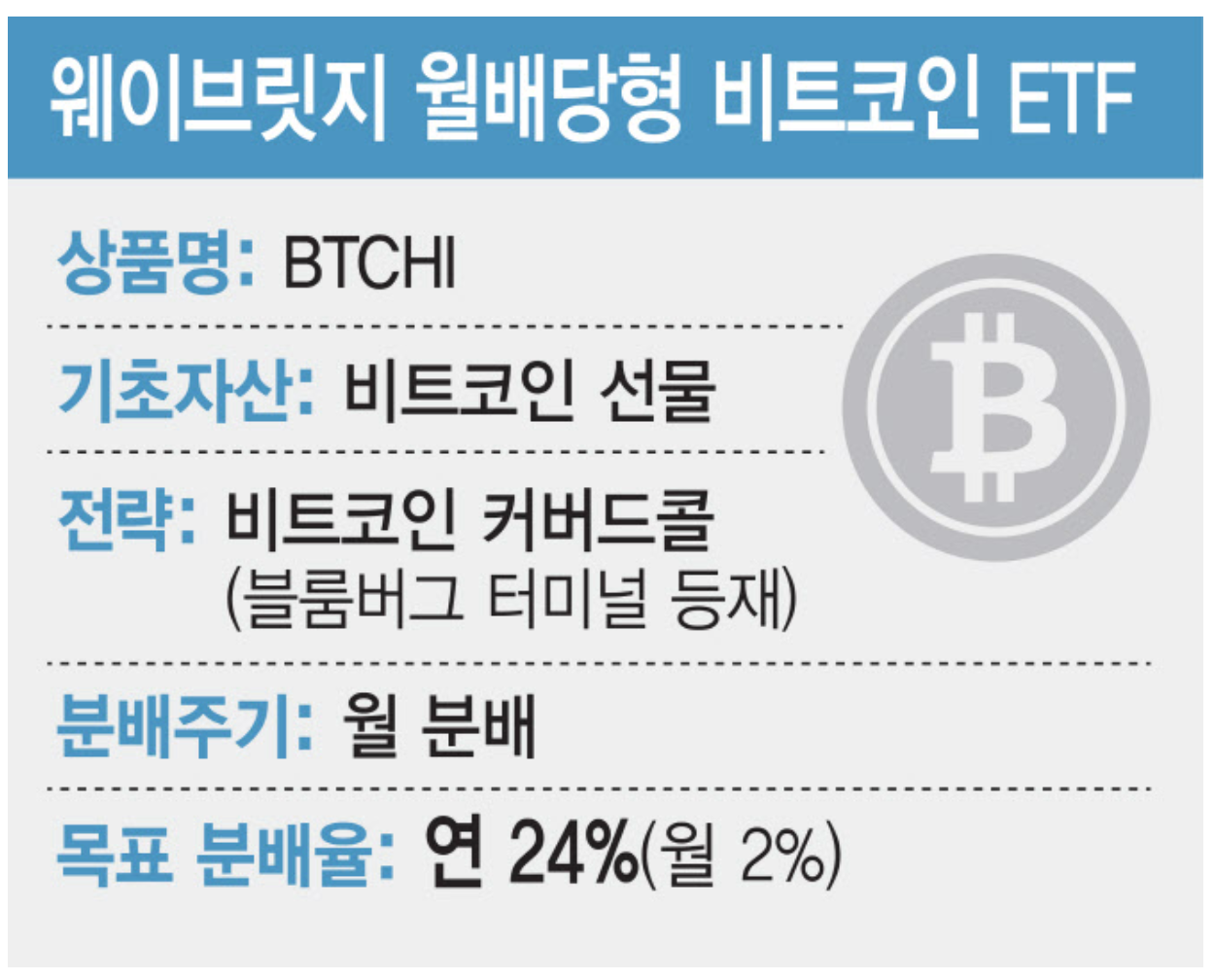주인공은 코드명 BTCHI로 월배당형 비트코인 ETF가 되겠습니다.