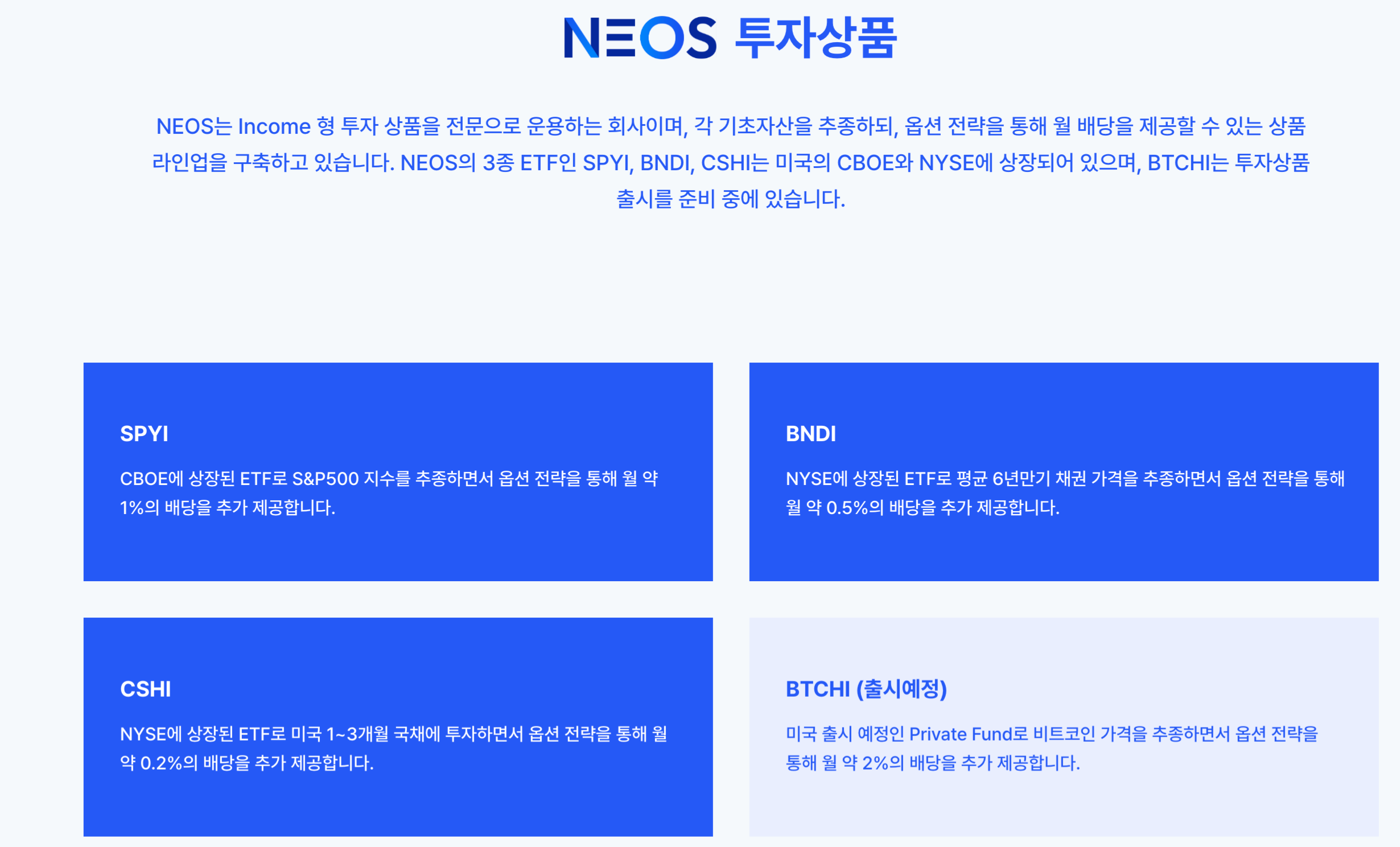 상품은 이미 SPYI, BNDI, CSHI 등의 상품을 출시하여 운용하고 있는 중이네요.