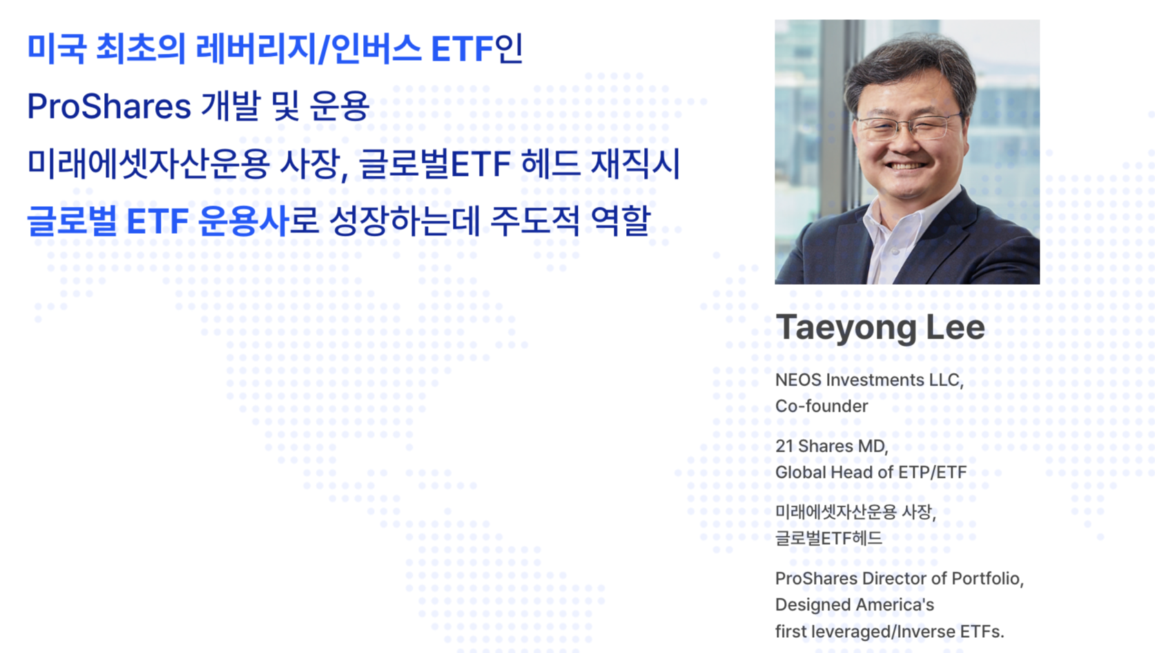NEOS는 웨이브릿지의 가상자산 퀀트 역량과 미국 내 옵션 인컴(Option Income) ETF 전략의 전문가로 구성되어 있으며, 수십 년간 전통적인 자산 관리 및 인덱싱 노하우에 디지털 방식의 전문 지식을 결합한 투자금융 솔루션을 제공합니다. 그 중심에 이태용 파트너와 핵심 멤버인 게럿(Garrett Paolella)과 트로이(Troy Cates)는 그동안의 금융 시장에서 입증된 실적을 바탕으로 옵션 기반 인컴 ETF전략과 퀀트 역량을 결합한 상품들을 출시하며 디지털 자산 시장에 있어서도 반복된 성공의 청사진을 제시합니다.
