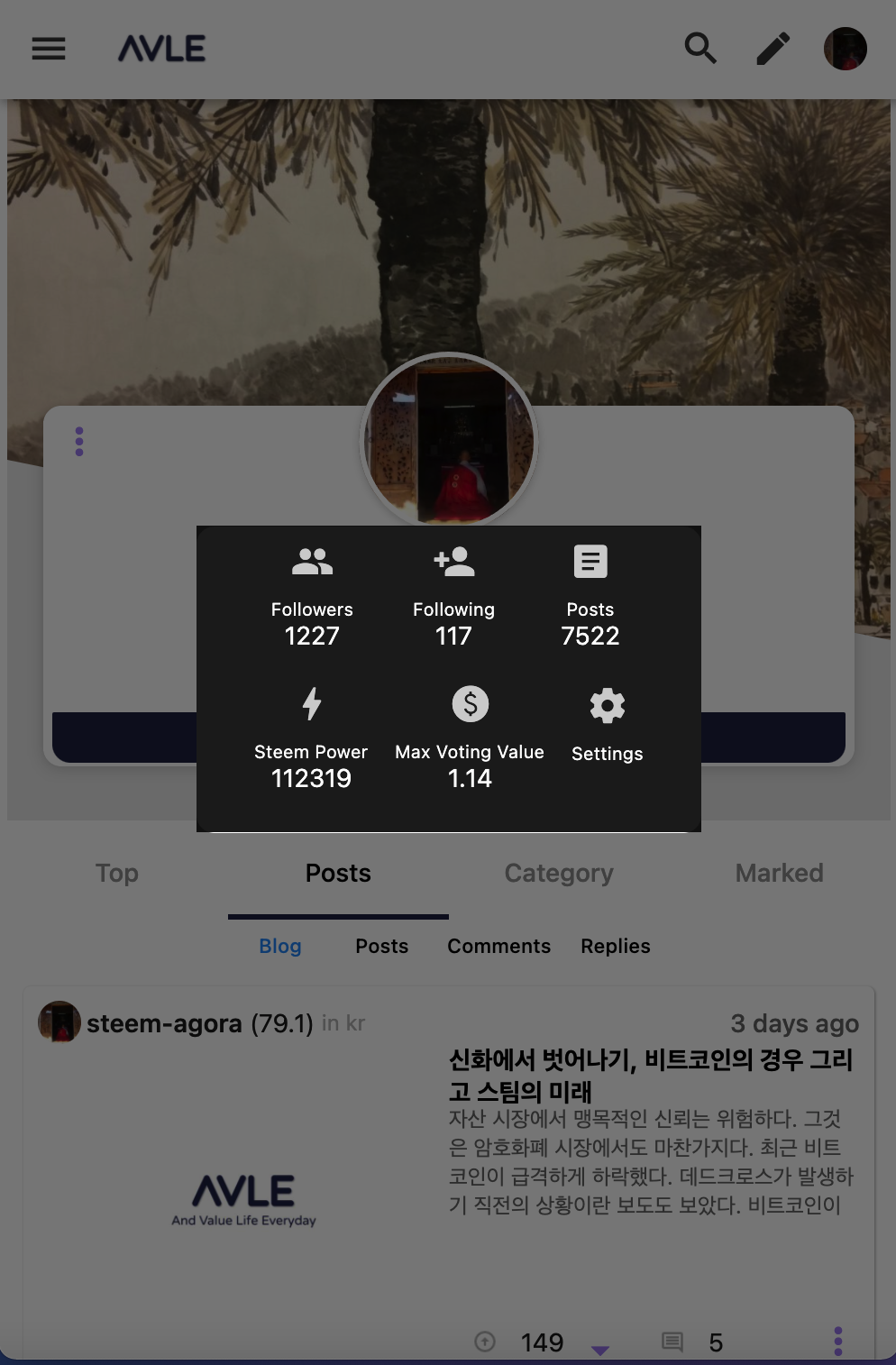 옆에 있는 posts는 보시기만 해도 알 수 있을 것입니다. 스팀잇의 기능과 동일합니다.