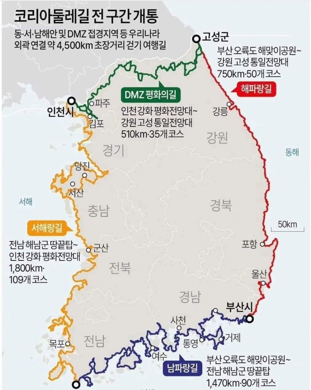 현재 접근이 가능한 국토 전체를 한바퀴 돌아 걸을 수 있는 코리아 둘레길 전 구간이 개통되었다는데 그 길이가 무려 4,500km라고 하네요. 하루 30km씩 걷는다고 해도 150일...