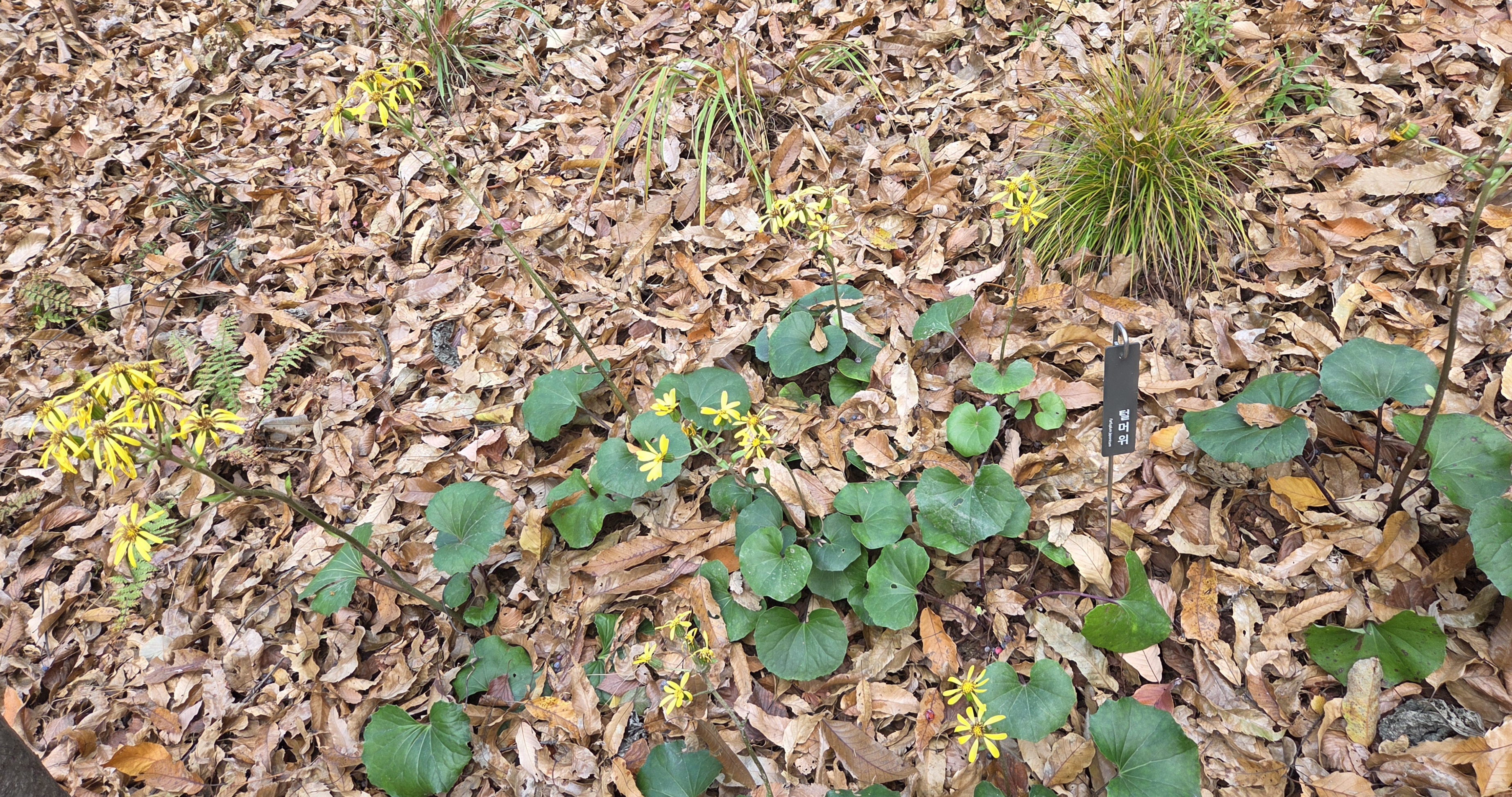 추위에 강하다는 국화과의 토종 여러해살이 식물 털머위가 양지바른 곳에 노랗게 피었는데, 낙엽들에 둘러쌓여 제 색깔을 뽑낼 수가 없어 눈으로 볼 때보다 선명하지가 않네요~
