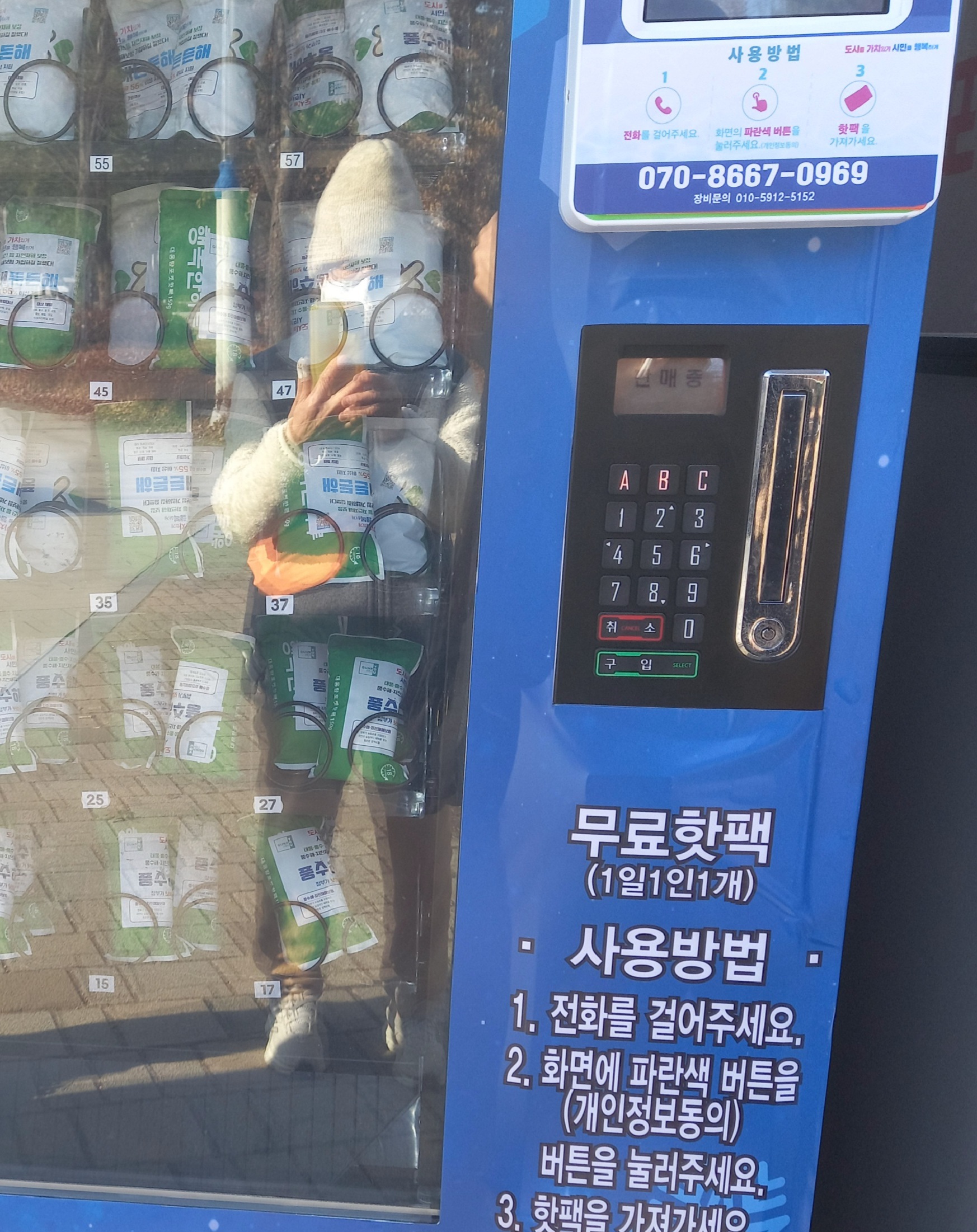 그앞에 사람들이 줄을 서 있고 핸드폰으로 안내문의 지시 대로 시행 하면 핫팩이 뚝딱 떨어져 나오는 광경을 보게 되었다.