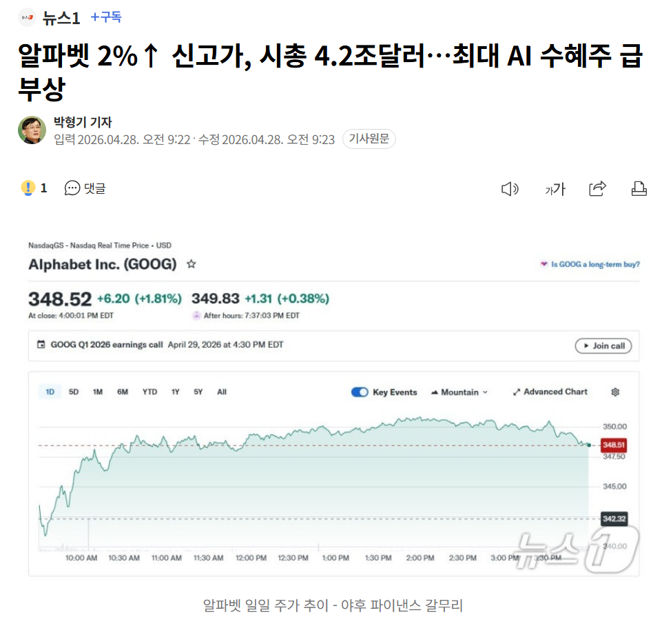 실적 발표를 앞두고 호실적 기대로 알파벳이 2% 가까이 상승, 사상 최고치를 경신한 것. 27일(현지 시각) 뉴욕증시에서 알파벳은 1.81% 상승한 348.52달러를 기록했다. 이는 사상 최고치다.
