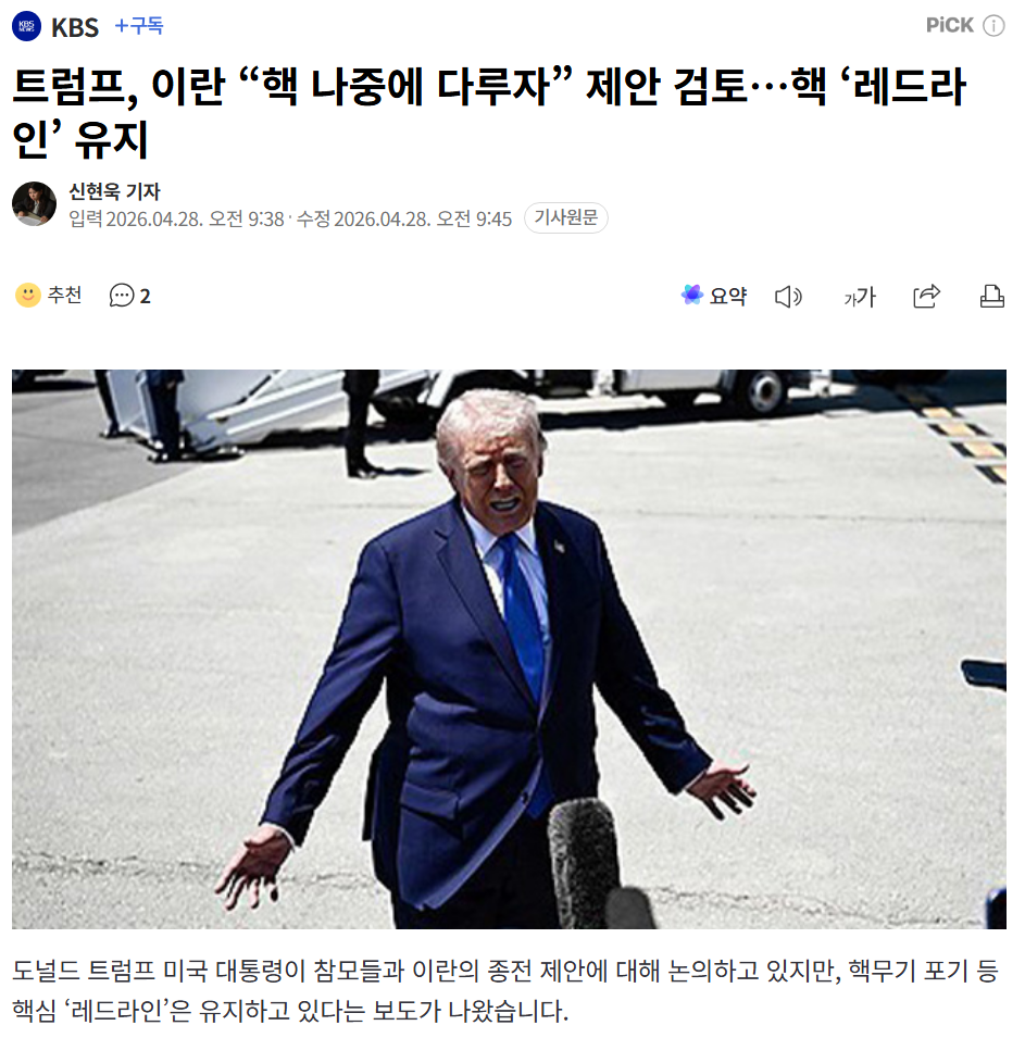 레빗 대변인은 “이란과 관련한 대통령의 레드라인은 매우 분명하다”며 트럼프 대통령이 이 사안에 조만간 입장을 밝힐 것이라고 설명했습니다.