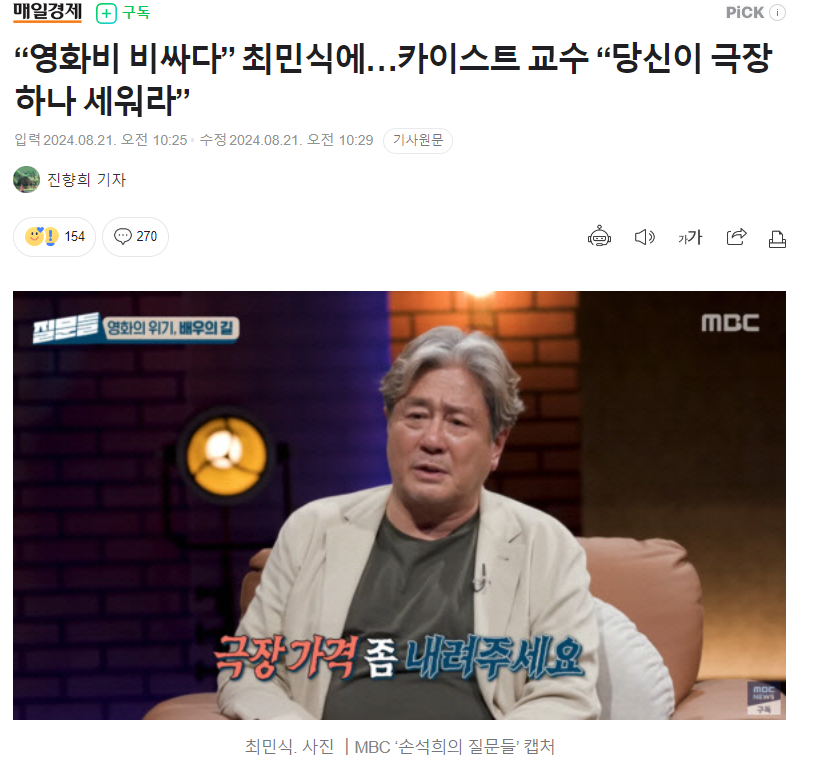 배우 최민식이 최근 영화관 티켓 가격이 비싸다고 발언한 것과 관련, 현직 카이스트 교수가 “무지한 소리”라고 지적했다.