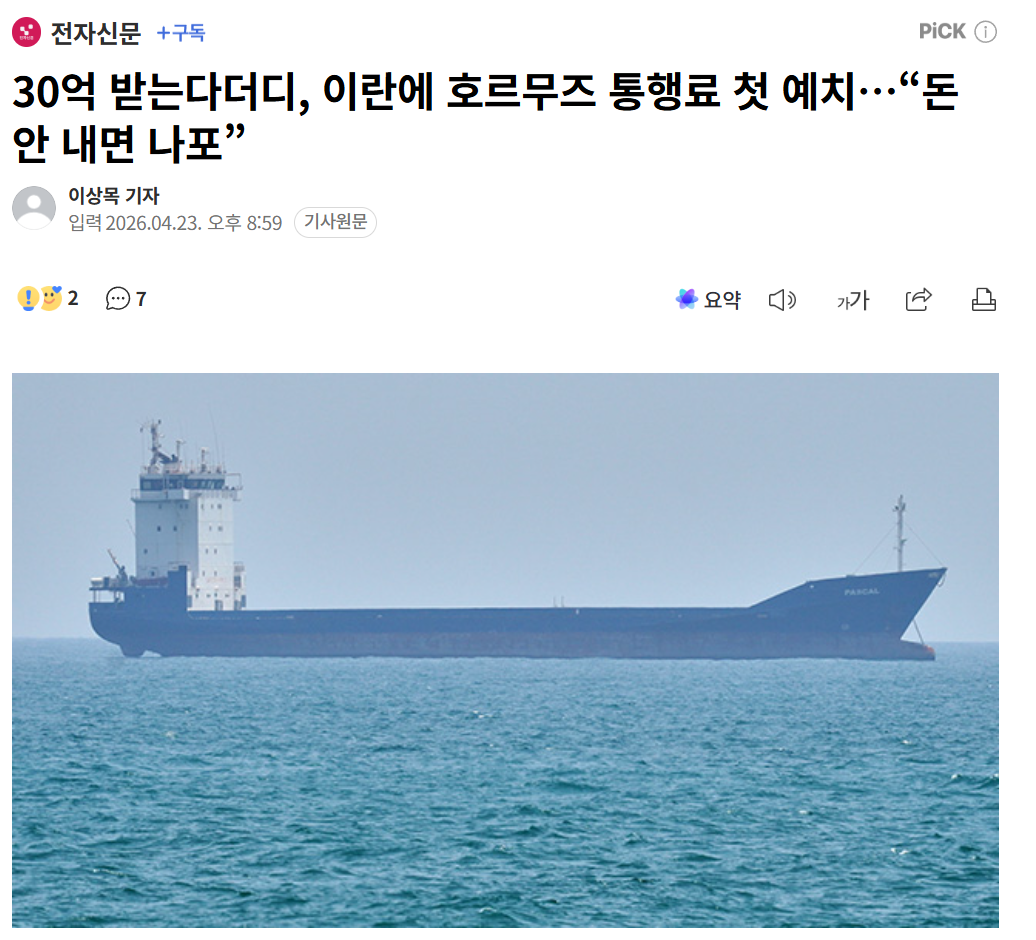 30억 받는다더디, 이란에 호르무즈 통행료 첫 예치…“돈 안 내면 나포”