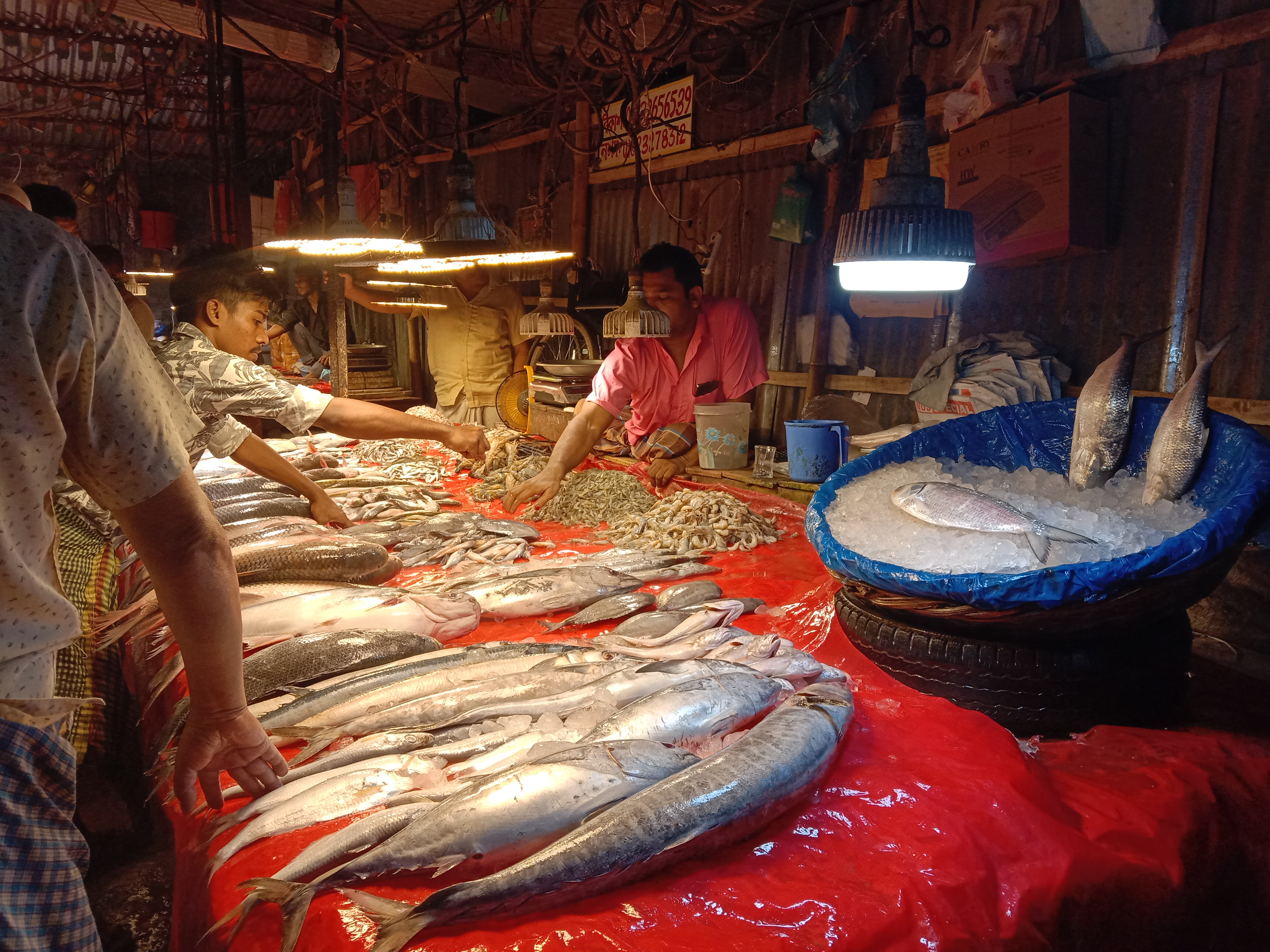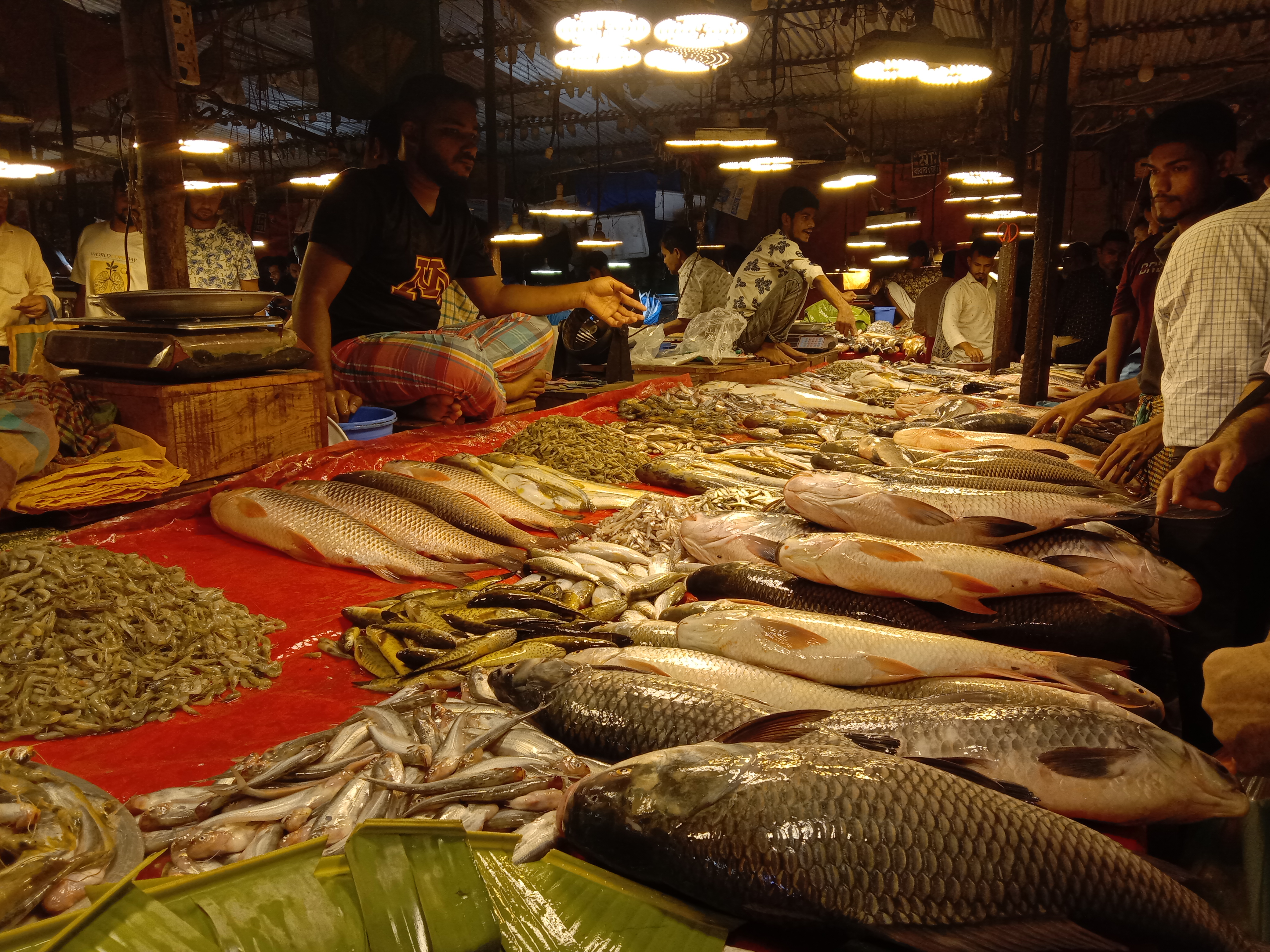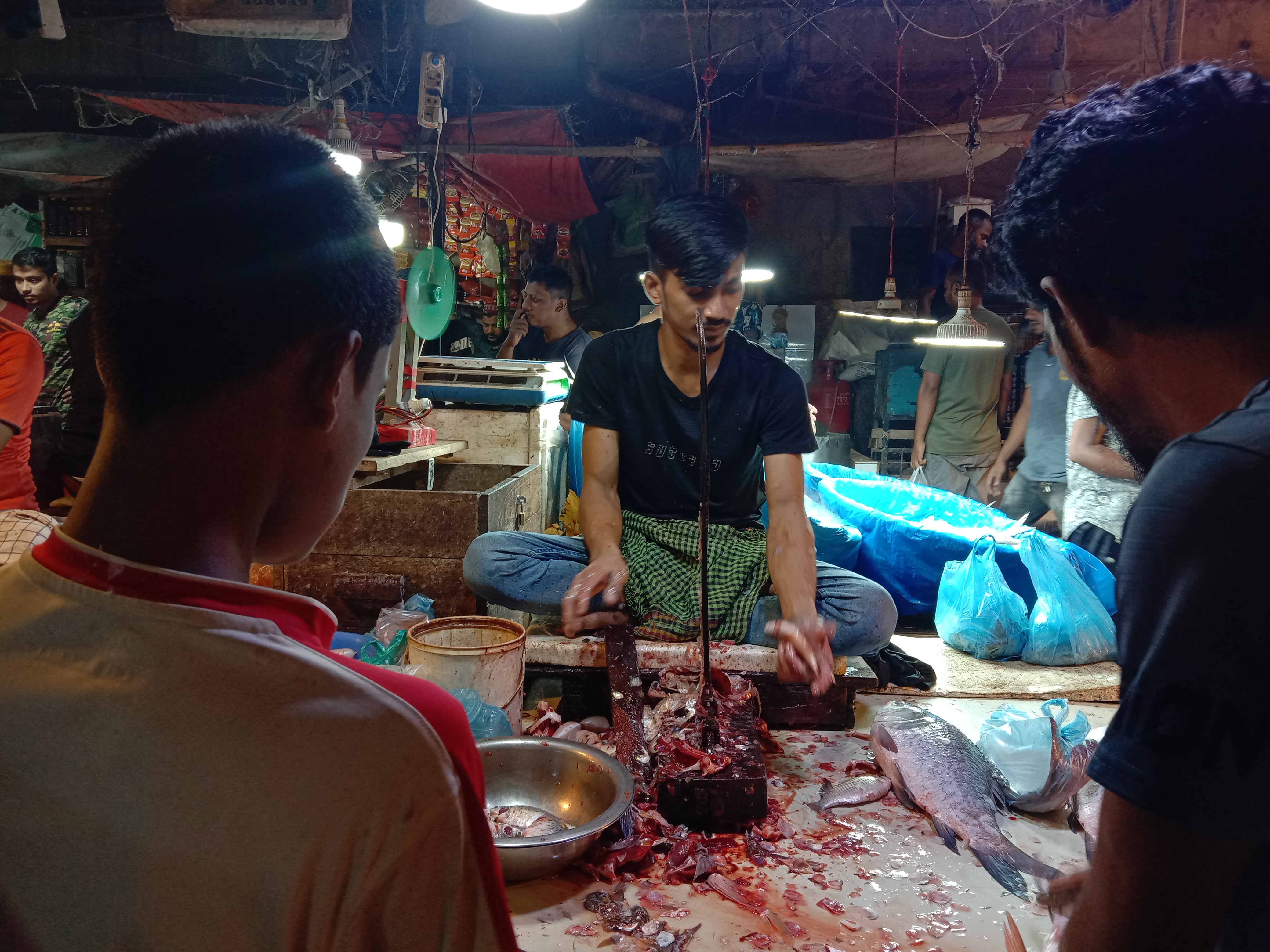 তো আমরা যেখানে থাকি তার পাশেই একটা বড় মাছ বাজারে চলে গেলাম। মাছ বাজারে দেখি অন্য সব মাছের তুলনায় ইলিশ মাছ অনেক বেশি রয়েছে। এবং বেশিরভাগ ইলিশের সাইজ দেড় থেকে দুই কেজি। ইলিশগুলো দেখে নিজের মাথা ঠিক রাখা মুশকিল হা হা। যাইহোক আমাদের খাওয়ার মতো একটা মাছ কিনে নেয়। কিন্তু সমস্যা টা বাঁধে ঐসময়। মাছ কিনলাম ঠিক আছে কিন্তু মাছটা পরিষ্কার করবে বা কাটবে কে হা হা। ঢাকা শহরে অবশ্য বাজার থেকে মাছ কেটে নিয়ে আসার ব্যবস্থা আছে। আমরা যেখানে গেছিলাম এই বাজারেও ছিল। কিন্তু ফাঁকা ছিল না। যেখানেই যাচ্ছিলাম বলছে ভাই পরে আসেন না হলে দেরী হবে। এটাতে একপর্যায়ে আমার বিরক্তি ধরে যায়। এক মাছ কিনে তো মহা মুশকিলে পড়লাম হা হা।।