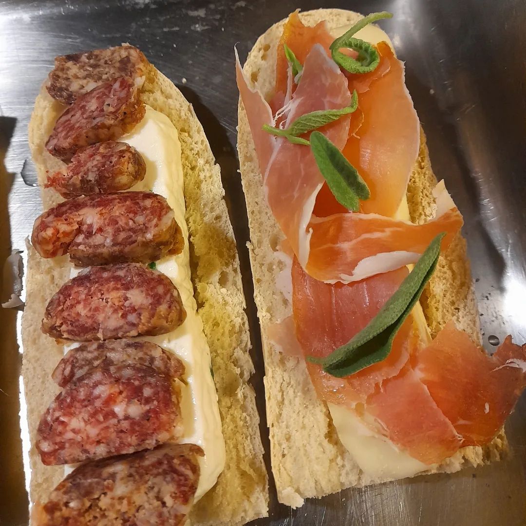 - baguette with pasta filata, raw ham and sage