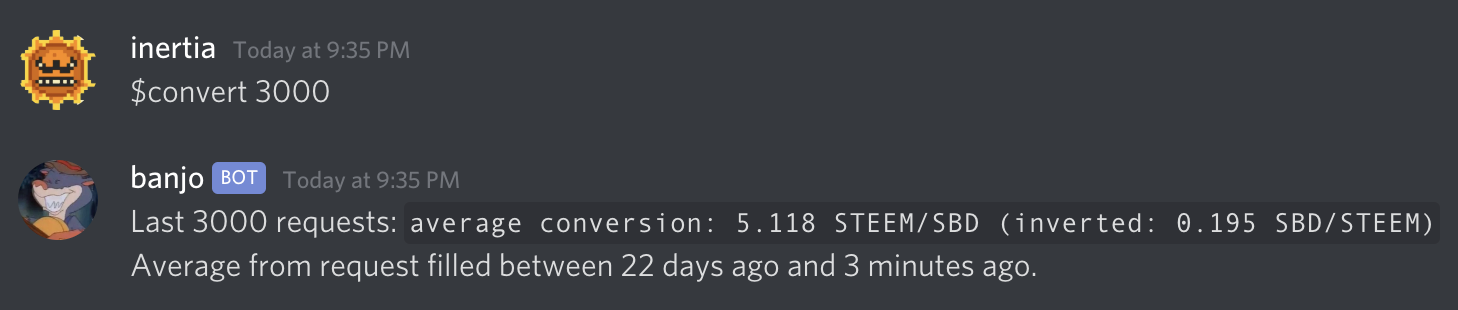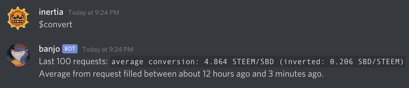 The purpose of the $convert report command is to get an idea about how beneficial SBD to STEEM conversion is. It does this by querying for the last 100 fill_convert_request virtual operations, then calculating an average.