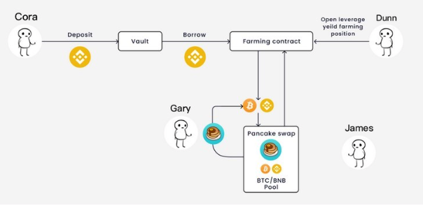 the yield farmer wants to open a leveraged yield farming position on the BTC/BNB pair; he borrows BNB from the vault and enjoys higher yield farming rewards.