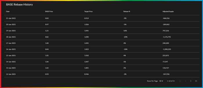 - Base Rebase History displays information concerning all rebases that have occurred so since Base Protocol’s launch day.