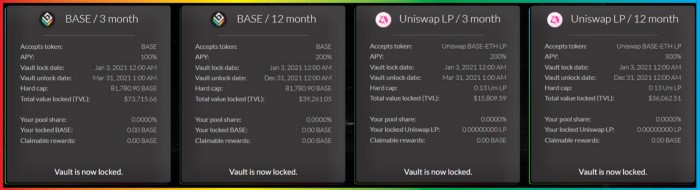 BASE vaults provide 100% APY for 3 months and 200% APY for 12 months.