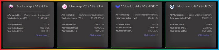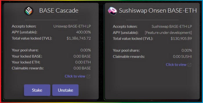 - BASE/ETH LP tokens can be staked on BASE Cascade and Sushiswap Onsen.