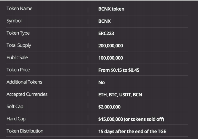 - Bcnex는 BCNX라는 기본 토큰으로 작동합니다. 정확히 2 억개의 BCNX가 발행 될 것이고 수량은 결코 증가하지 않습니다. BCNX는 이더리움 블록 체인에 출시된 ERC223 표준 토큰입니다.