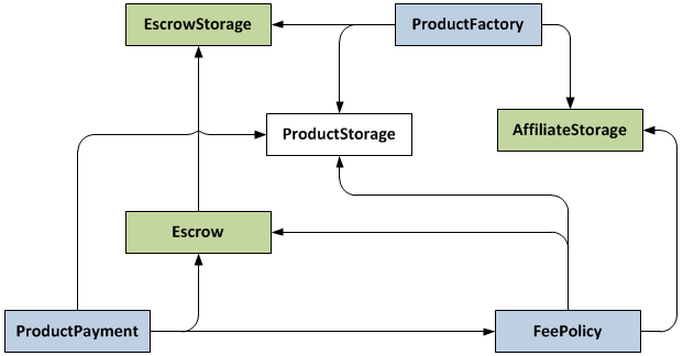 Main contract that users interact with is ProductPayment. It was updated to support custom escrows feature as well as new functions like revoking a purchase as a merchant or confirming product’s delivery as a customer. Escrow information is provided by Escrow contract that refers to EscrowStorage to retrieve data about escrow fees and complaint time limit for every product. The same information is needed by FeePolicy contract which is responsible for calculating amount of fees to pay to affiliate, escrow, and BCShop.io itself. Affiliate fee is provided by AffiliateStorage contract.