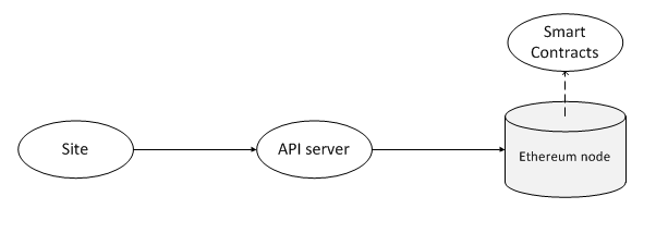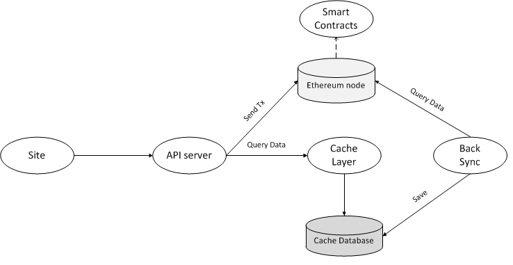 API server will request the Cache Layer for some of the data (for example, events). This layer is used only for off-chain situations, like the list of purchases. If we need to send a transaction, it still goes right to the Ethereum node.