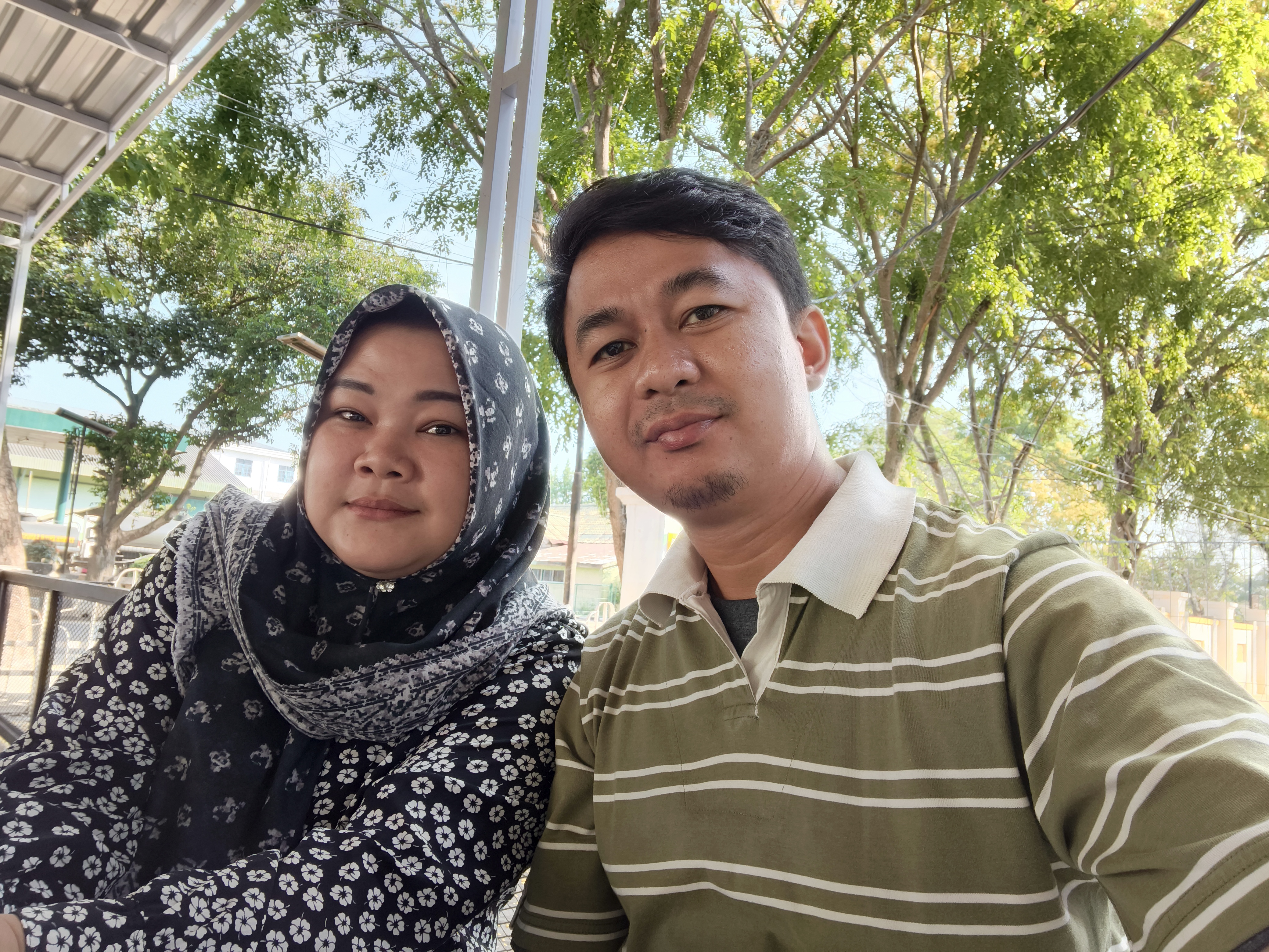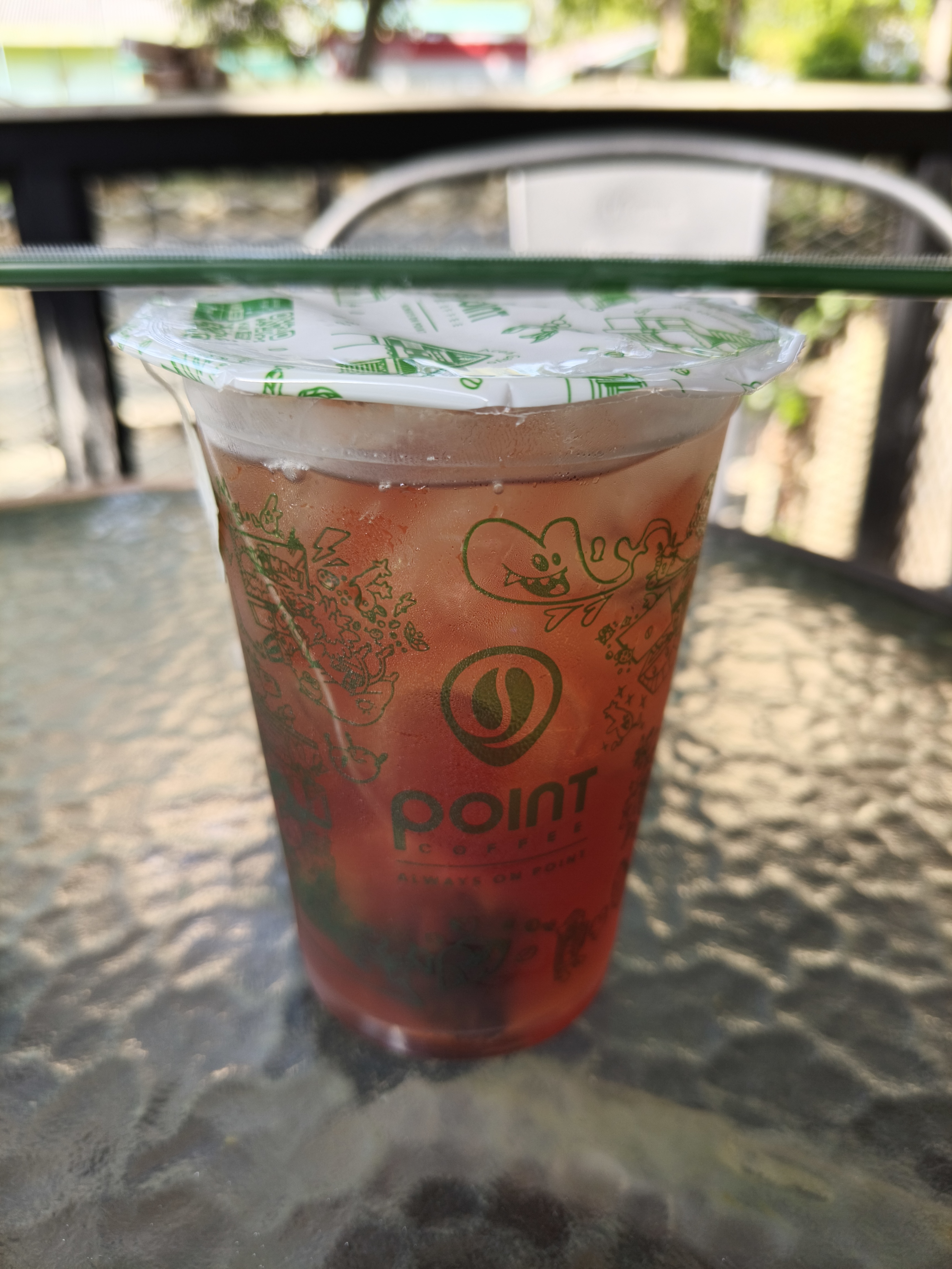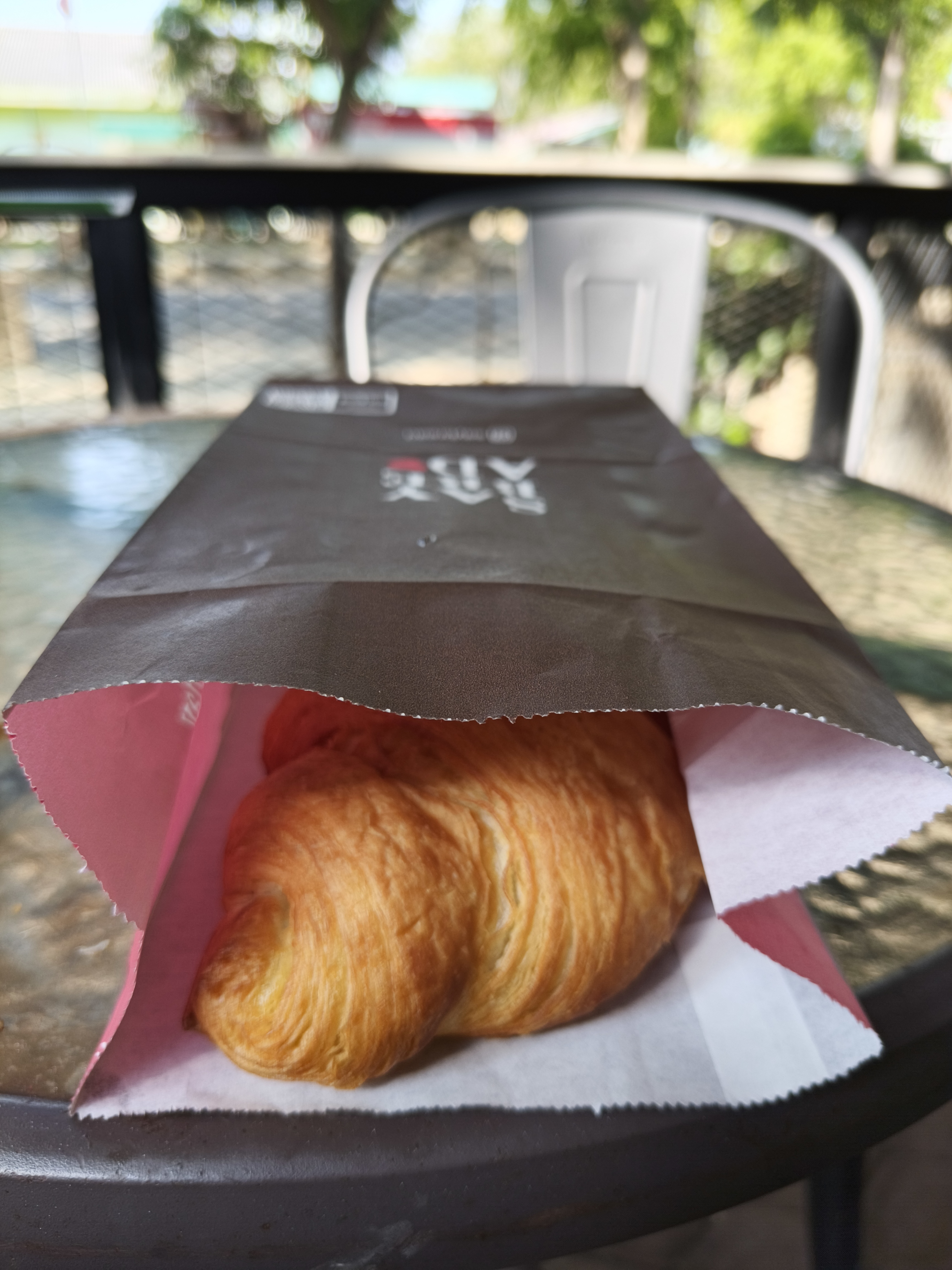 My wife and I took a seat in the outdoor seating area, where several sets of tables and chairs were neatly arranged. We chose a table in a corner near the street so we could feel the breeze more clearly; the sound of passing vehicles filled our ears, and the view of the surrounding buildings and trees set a cheerful mood for the day ahead.