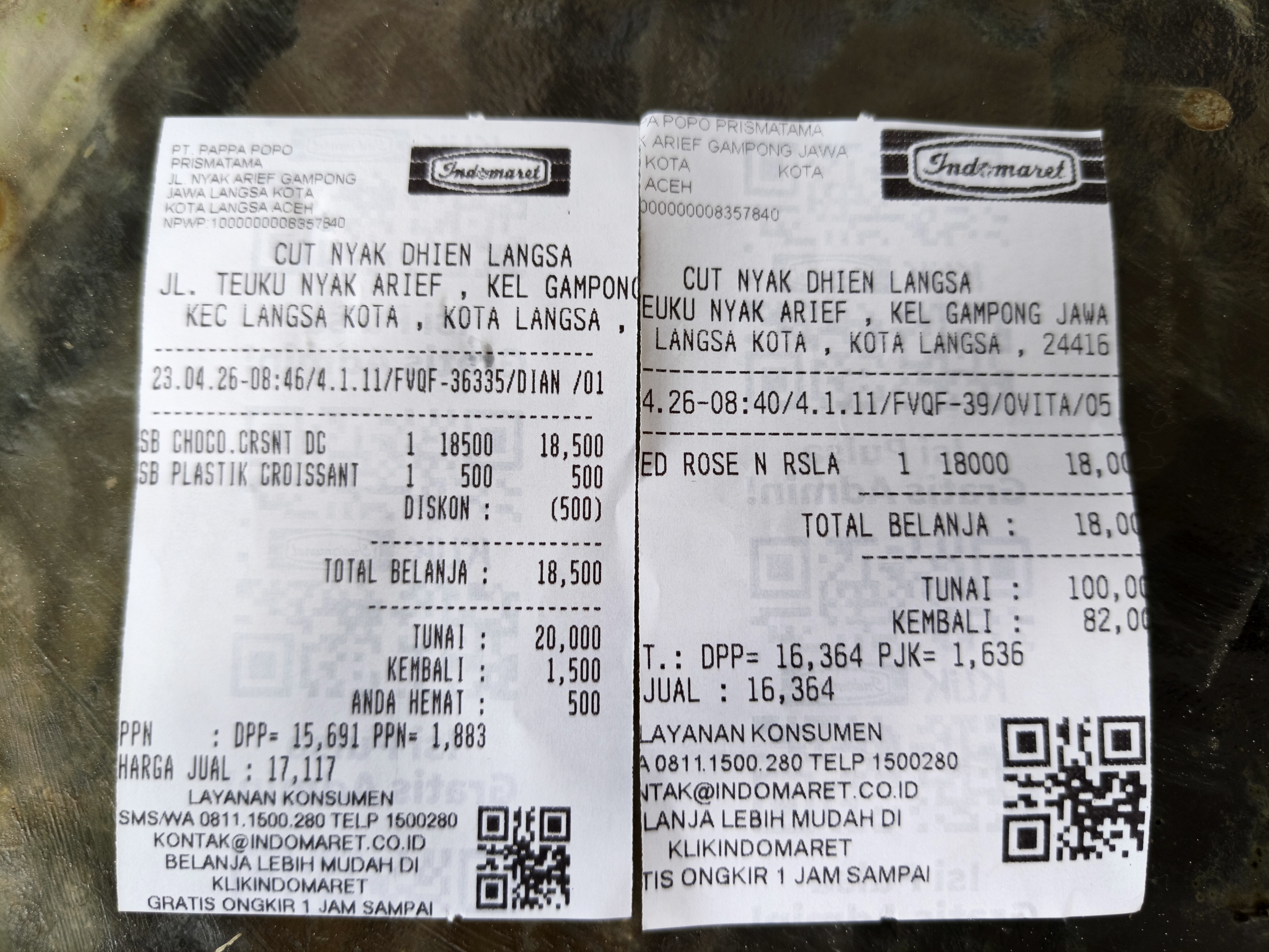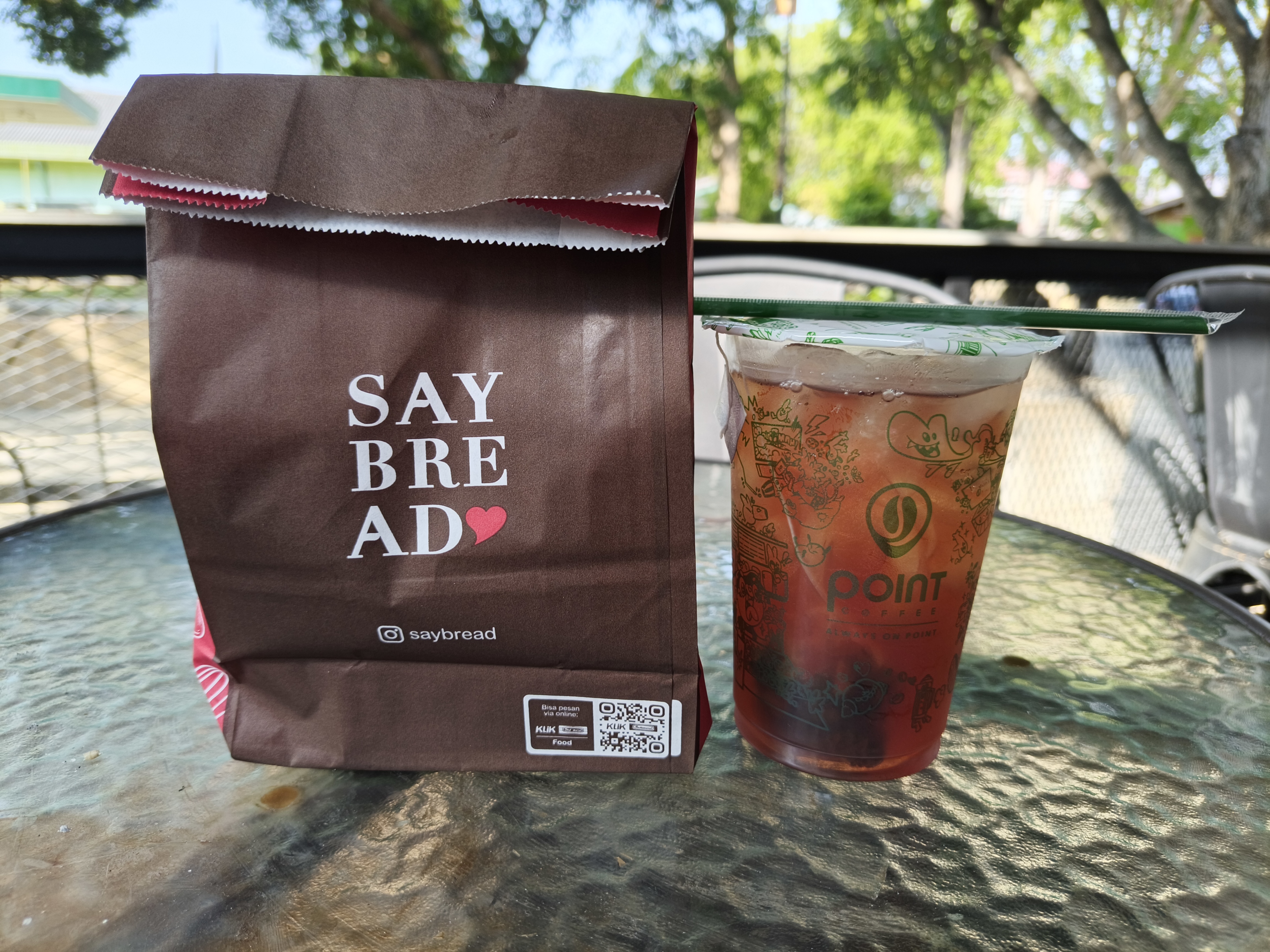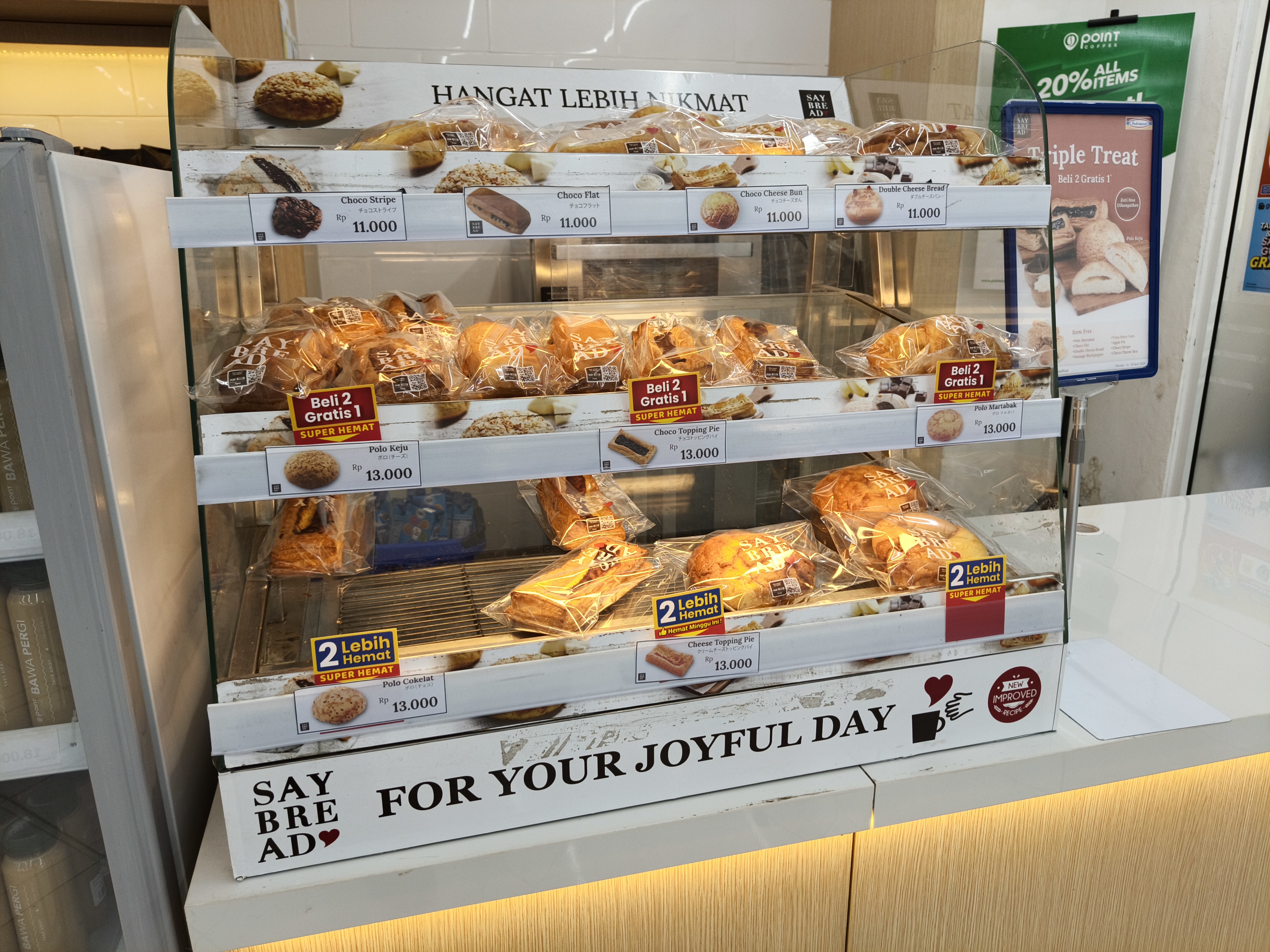 So that morning, my wife and I took the kids to their school, and after that I took my wife to the Indomaret on Cut Nyak Dhien Street to get some bread and drinks for breakfast. We arrived at the Indomaret, and I went over to the Say Bread section, where I chose a Choco Croissant. Then I went over to Point Coffee to order a Rose & Roselle Cold drink.