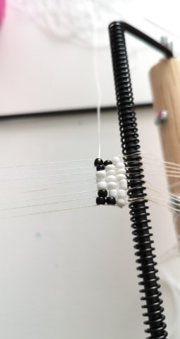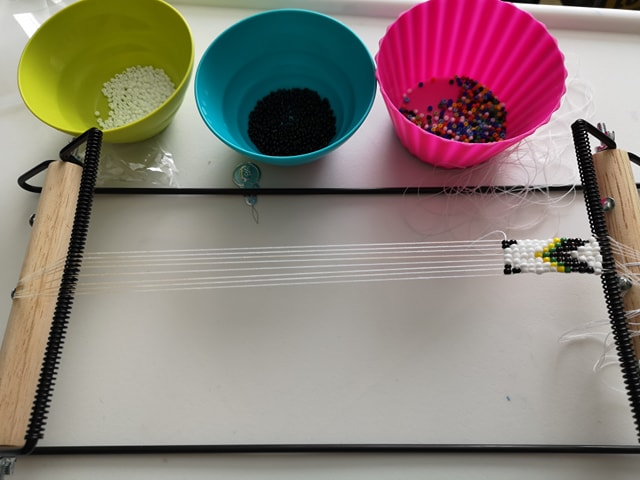 This is the beginning of a pattern that is already given in the box. As you can see, thread goes from one end to the other. We take the amount of beads needed for the pattern onto the beading needle, slide them down the string that is attached to the last string on the loom. Then we just fit the beads in from underneath, slide the needle and thread back through the beads, making sure that the needle passes over the loom threads and they will stay in place. pull tight though to secure them.
