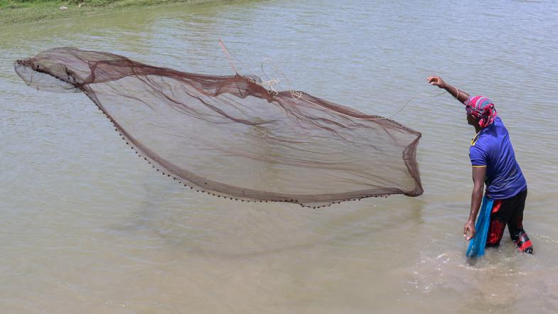 Thousands of water in the river Khulna is equal to the water of the knee. There is a man trying to hunt fish by throwing a net. Bhandarkot, Batiaghata, Khulna,