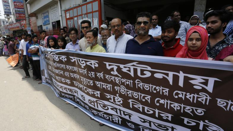 K Chowdhury Degree College student. College teachers and students organized a procession and procession on Tuesday demanding trial of the driver responsible for Mizan's death. Sayedabad, Dhaka,