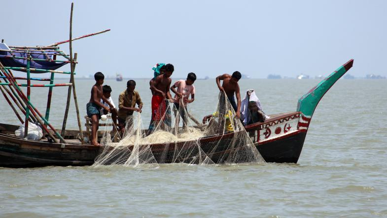 Fishermen throwing netting in the Meghna river for Hilsa. But they are not getting the help of Hilsha said. Meghna, Madanpur, Daulatkhan, Bhola
