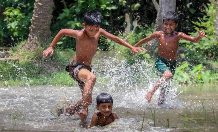 Children playing in the rain water accumulated in the fields. At the same time, there is comfort in summer. Bhandarkot, Batiaghata upazila, Khulna,