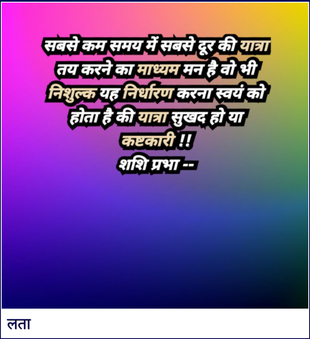 Beautiful thoughtsshashiprabha (66)in #beautiful • 18 days ago सबसे कम समय में सबसे दूर की यात्रा तय करने का माध्यम मन है वो भी निशुल्क यह तय करना स्वयं को होता है की यात्रा सुखद हो या कष्टकारी !! शशि प्रभा -- #thoughts #steem