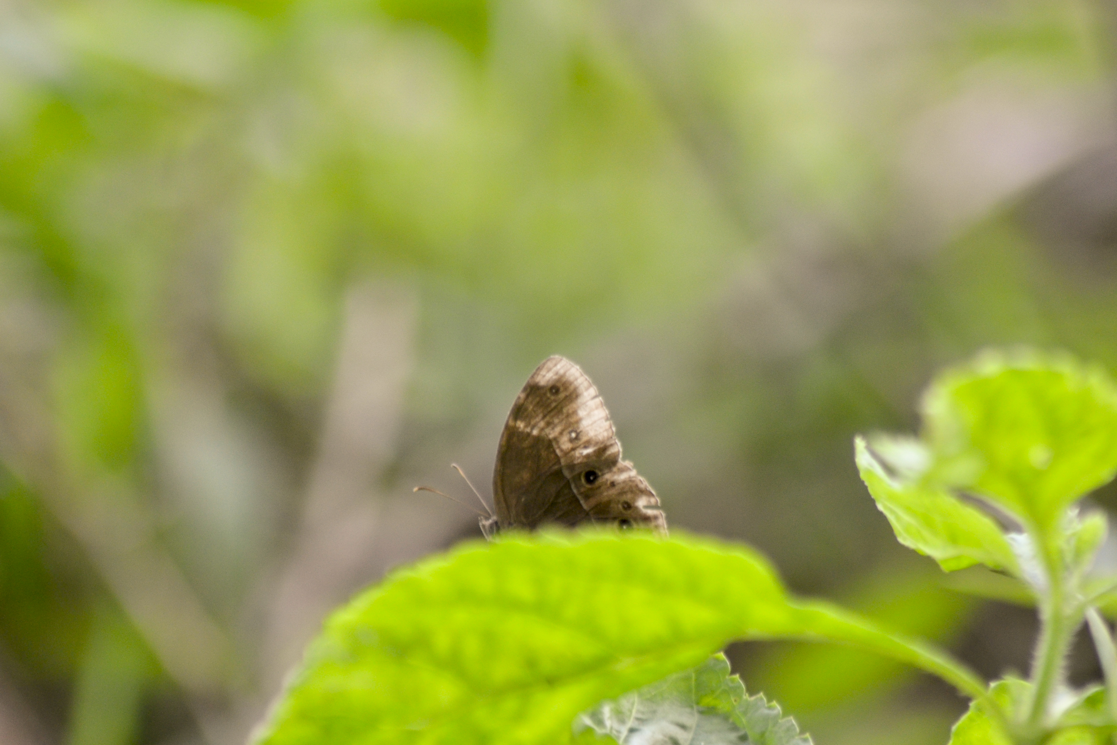 It is dark brand bush brown, a drab-looking butterfly that I found near a little stream in the wood. It has dark-greyish brown upperside and white post-discal stripes on the fore and hindwing. It is included as fast flyer butterfly that took me some time to get its photos.