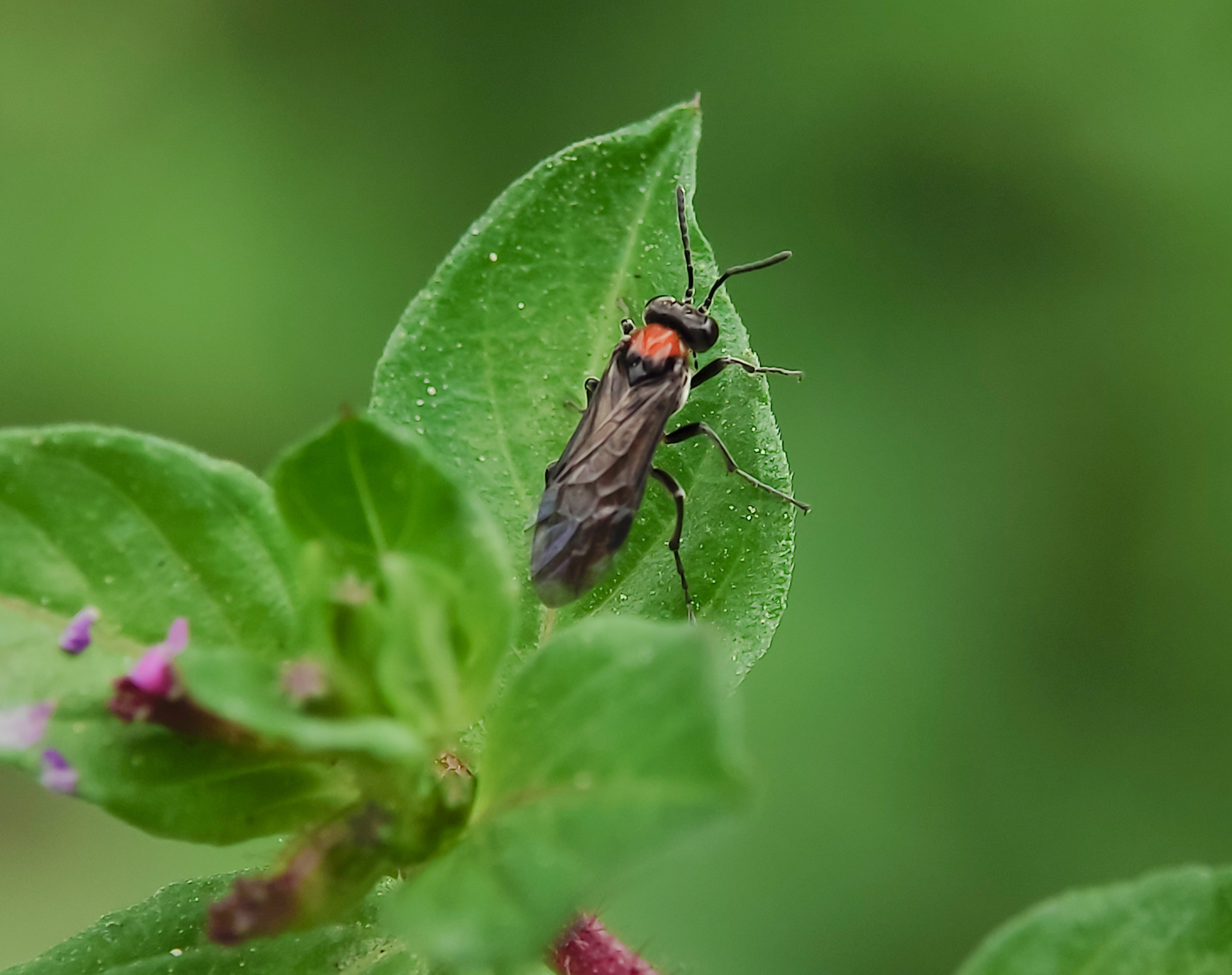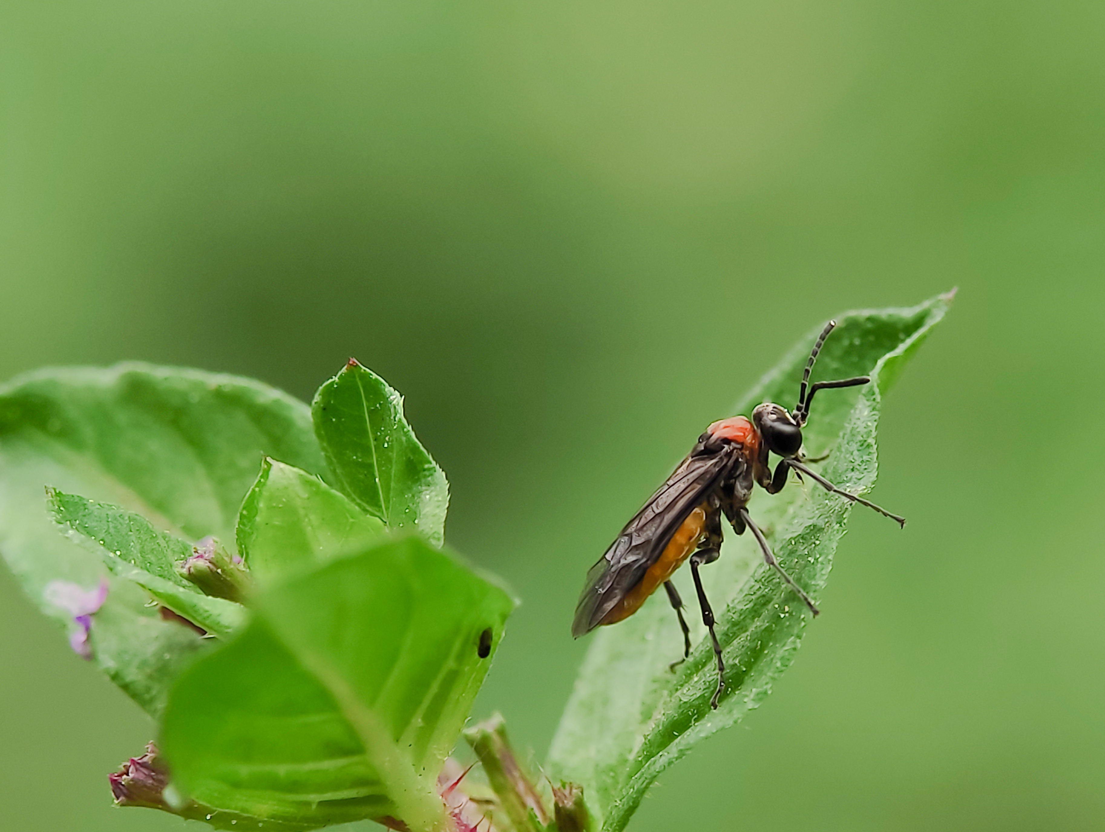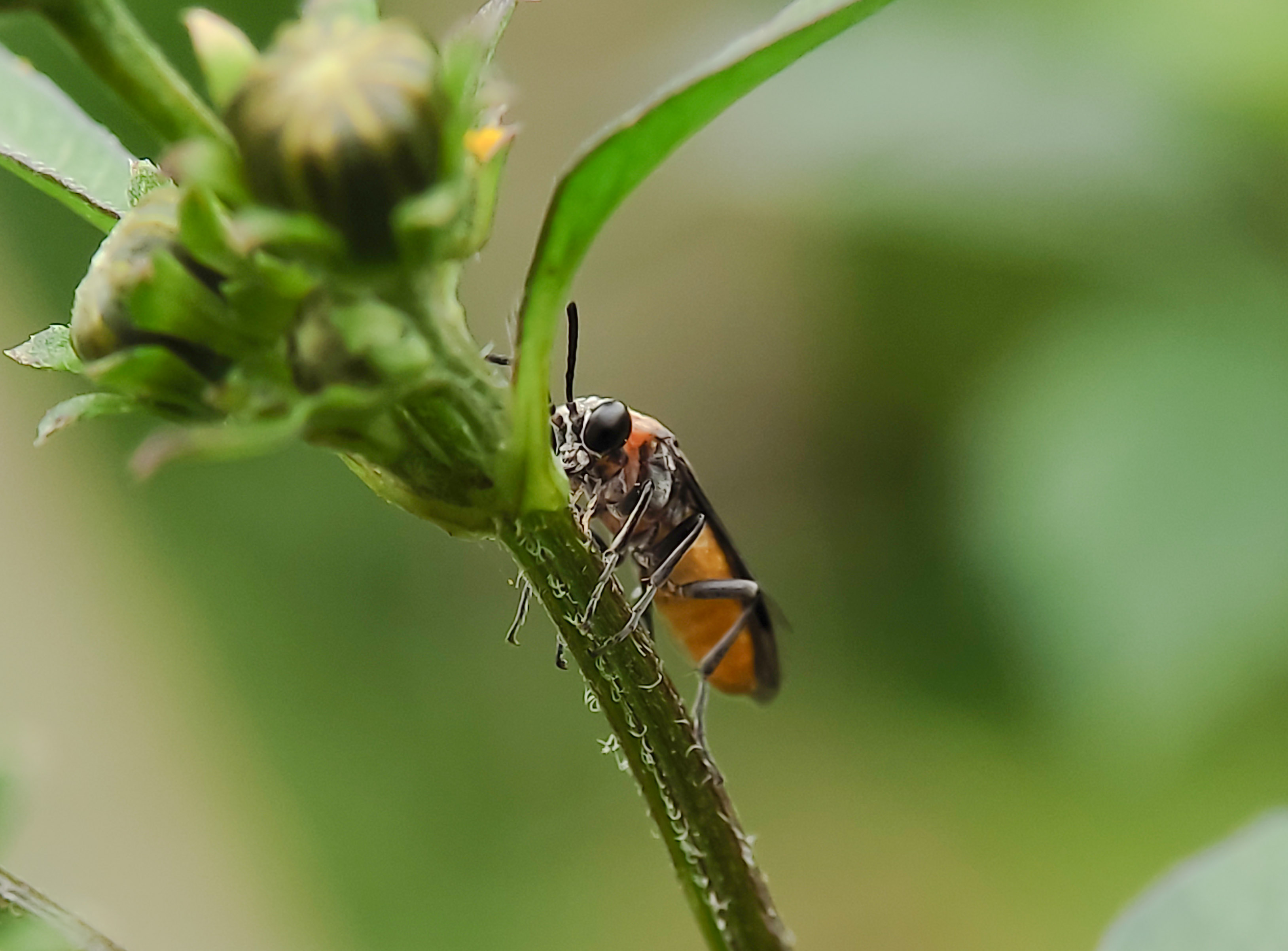 Sawfly (Symphyta) is another species of flies that is often seen visiting flowers or vegetation spots. I found this fly around the hill a little while ago. I only spotted this single fly flying here and there, running away by the time it sensed something approaching. Besides, it is a tiny insect, and moving fast was another problem in taking a shot with a smartphone. So things had been learned, when I faced such a situation, I had to allow myself to be away while keeping eyes on the subject, which I believe, most of the insects would come back to the spot where it first touched. Right! Not long after that, it came back with careful moves. There, I carefully approached while aiming the camera toward its face. Sawflies are related to bees, wasps, and ants (in the order Hymenoptera). They go through four stages in their life cycle – egg, larva, pupa, and adult. The larvae look similar to caterpillars or, in some cases, tiny worms.