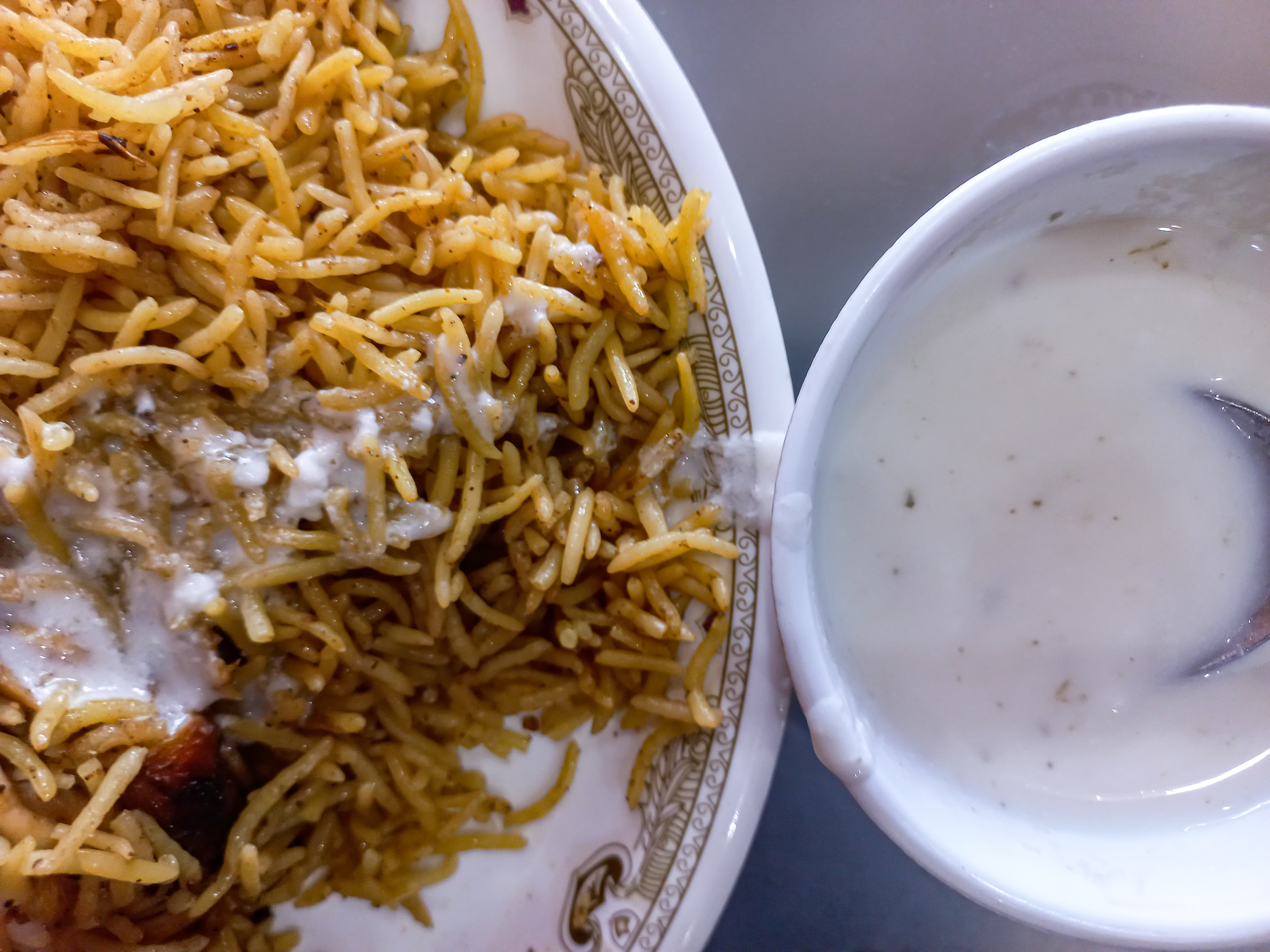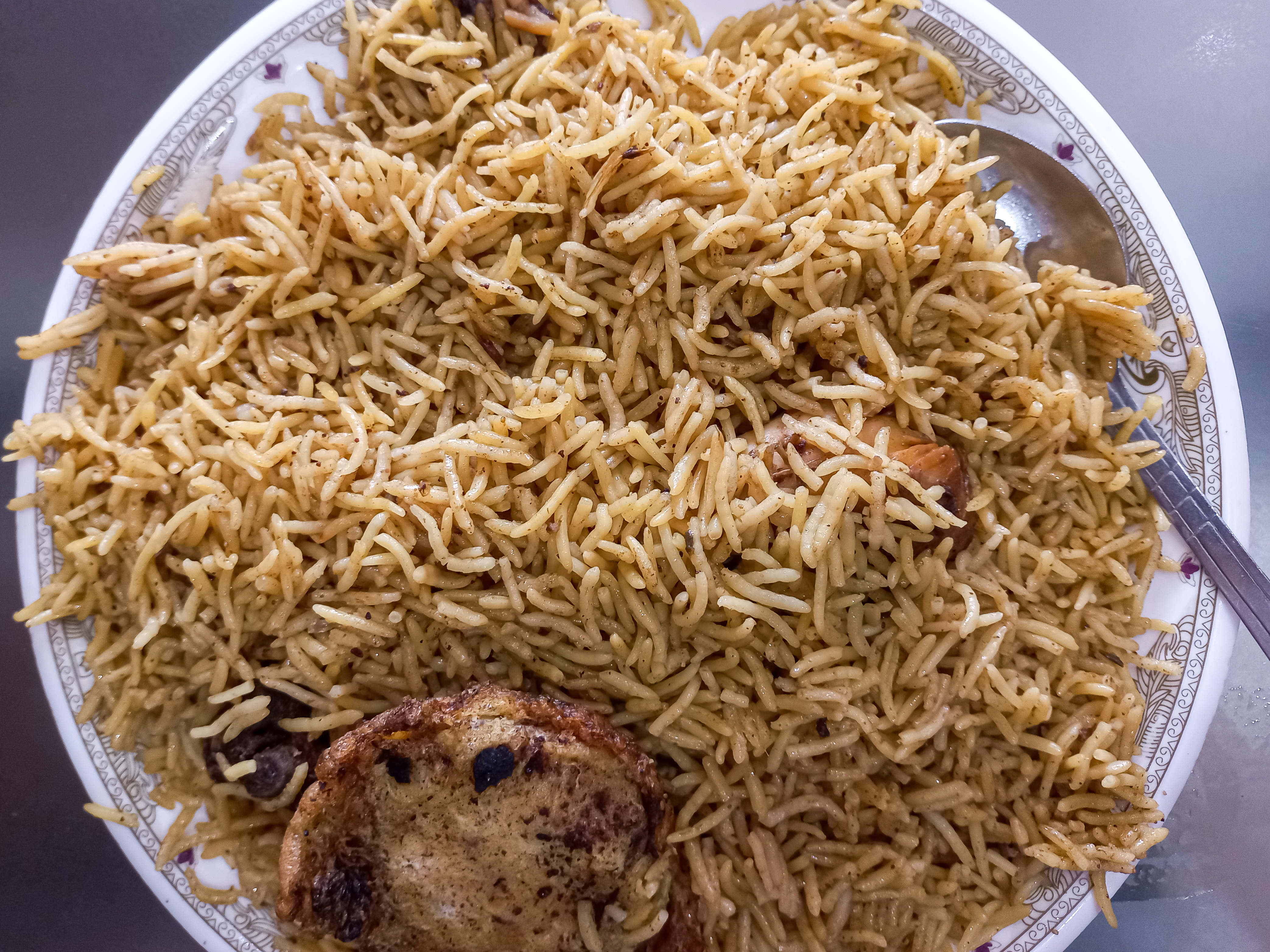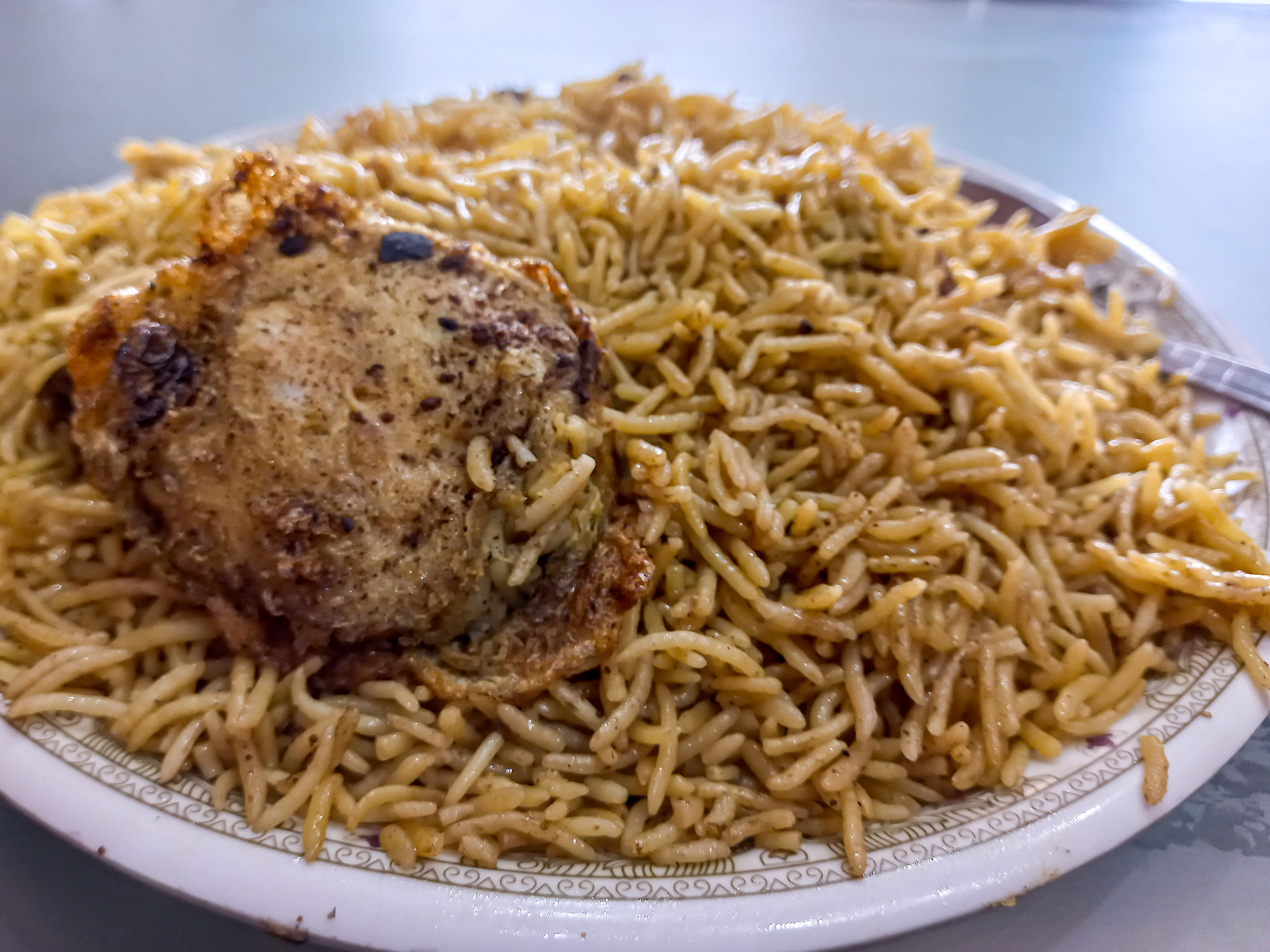 Hello members of Beauty of Creativity, how are you? I hope you all are well and enjoying life. Today I am offering pulao to all of you. Some days ago, I went to my city Faisalabad and on my way back home I felt hungry. I decide to eat the pulao. I stop my bike near a restaurant and order one plate of full pulao. On a full plate, they include a piece of fried chicken and a Shami Kebab.