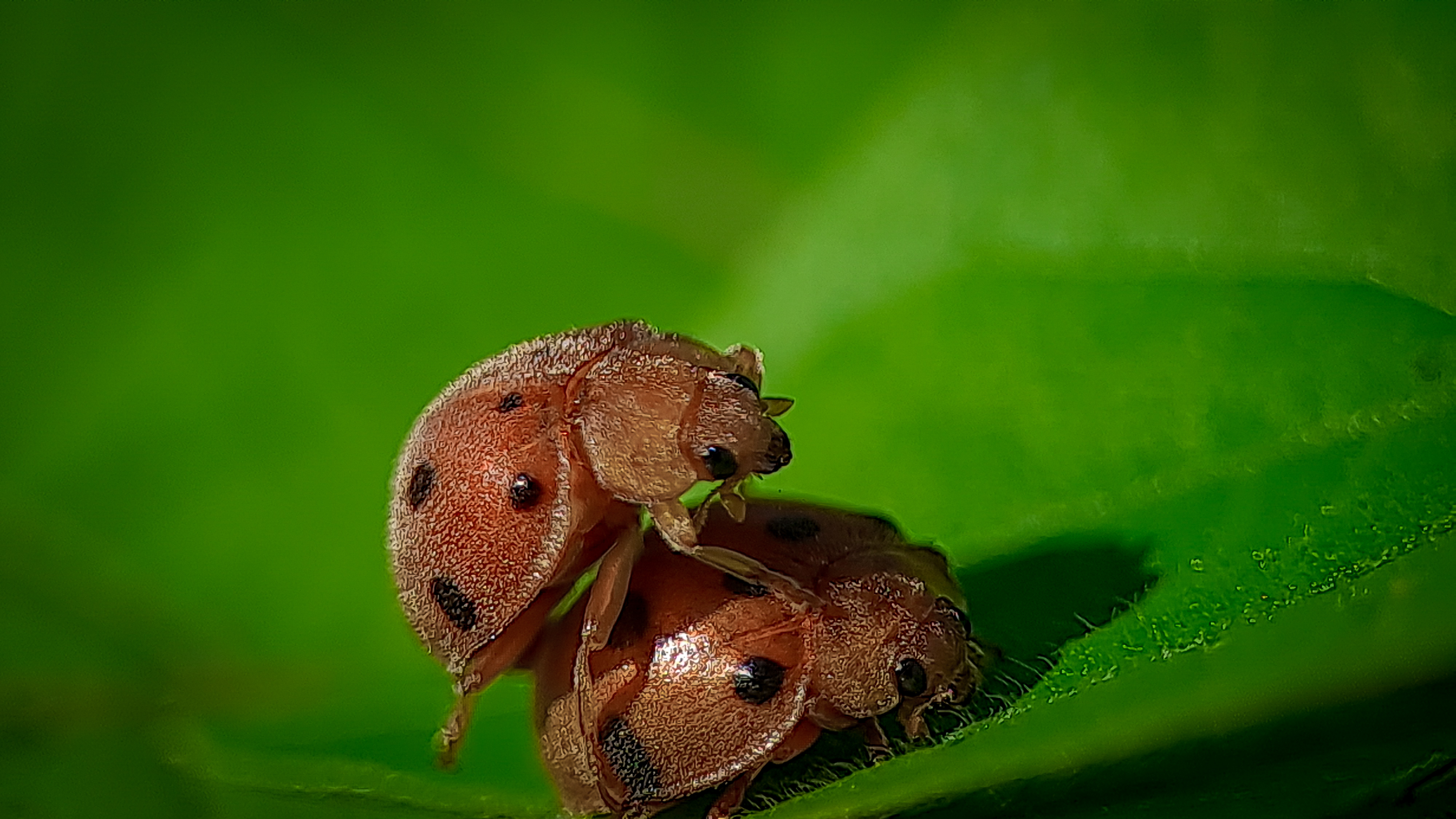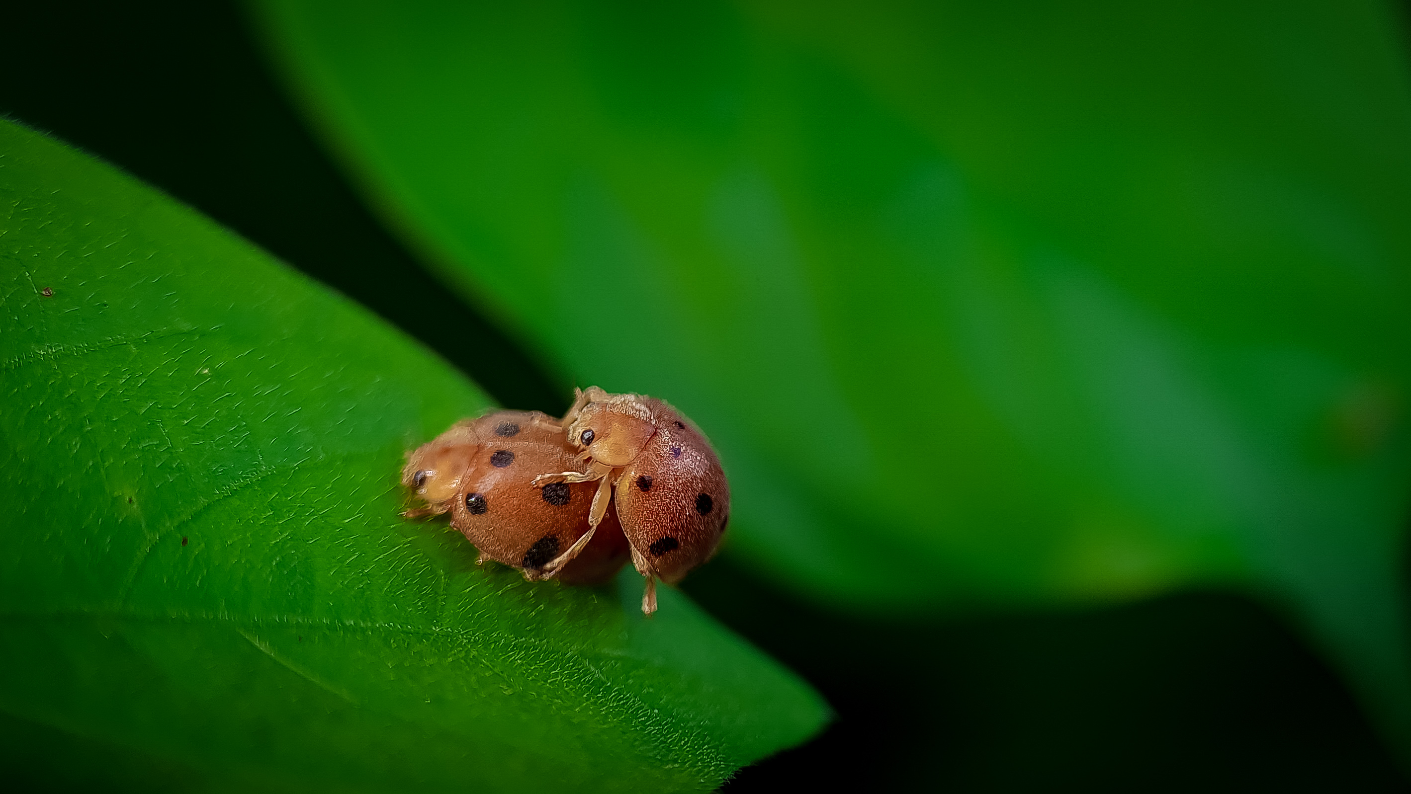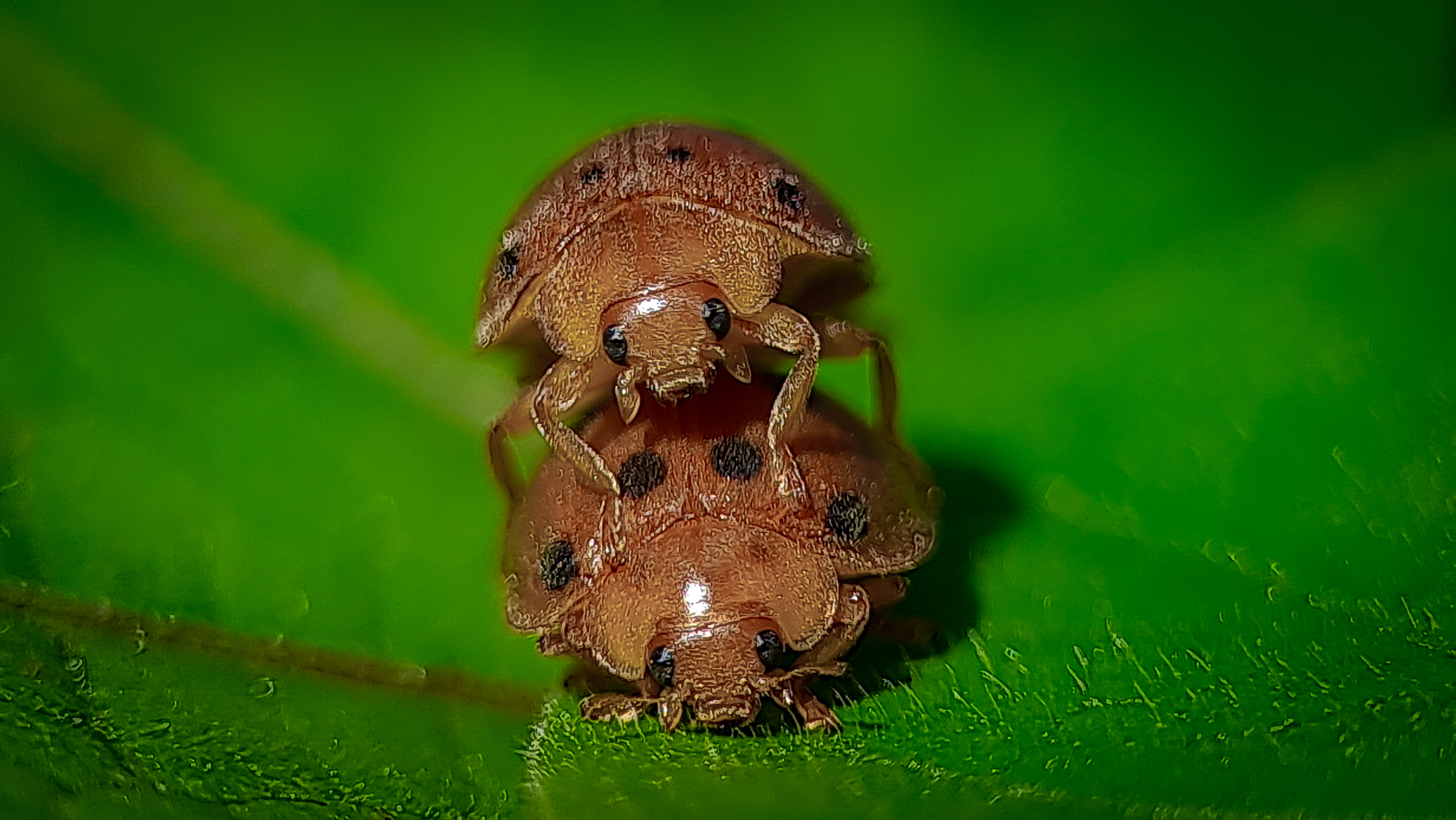 Greetings to all of us who have been in this beloved community, today I am back in front of your eyes to share some of my macrophotography with all of you and the picture that I display on this occasion is a ladybug making love on a leaf and this ladybug I found it a few days ago ago in the forest of Aceh near my house.