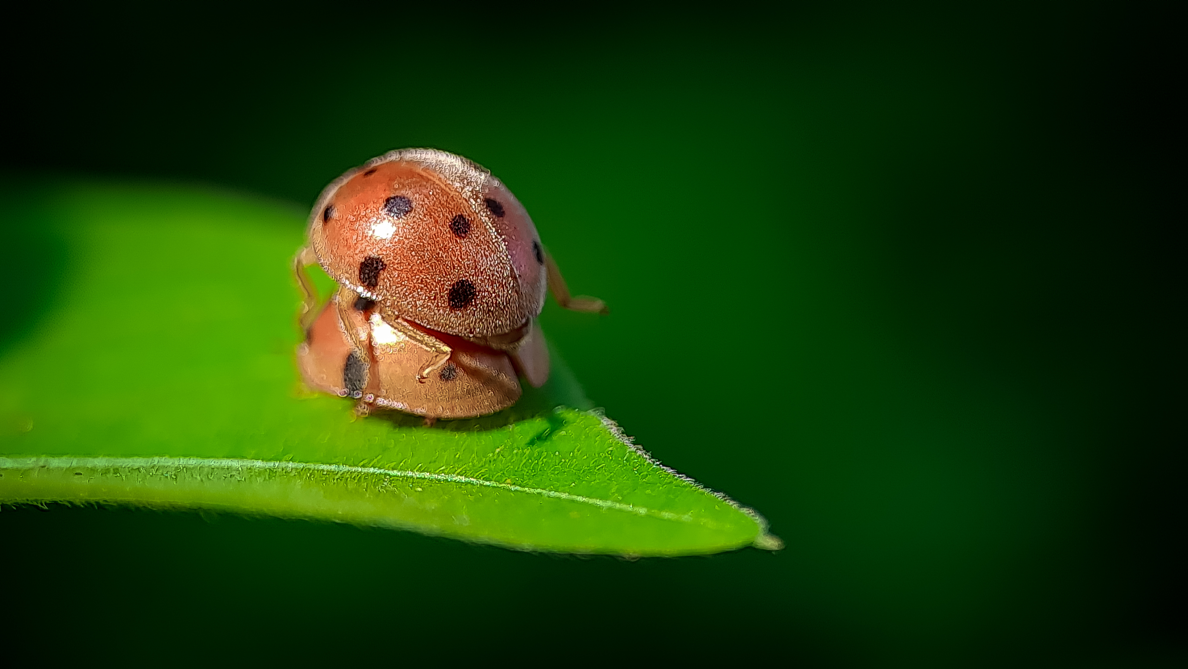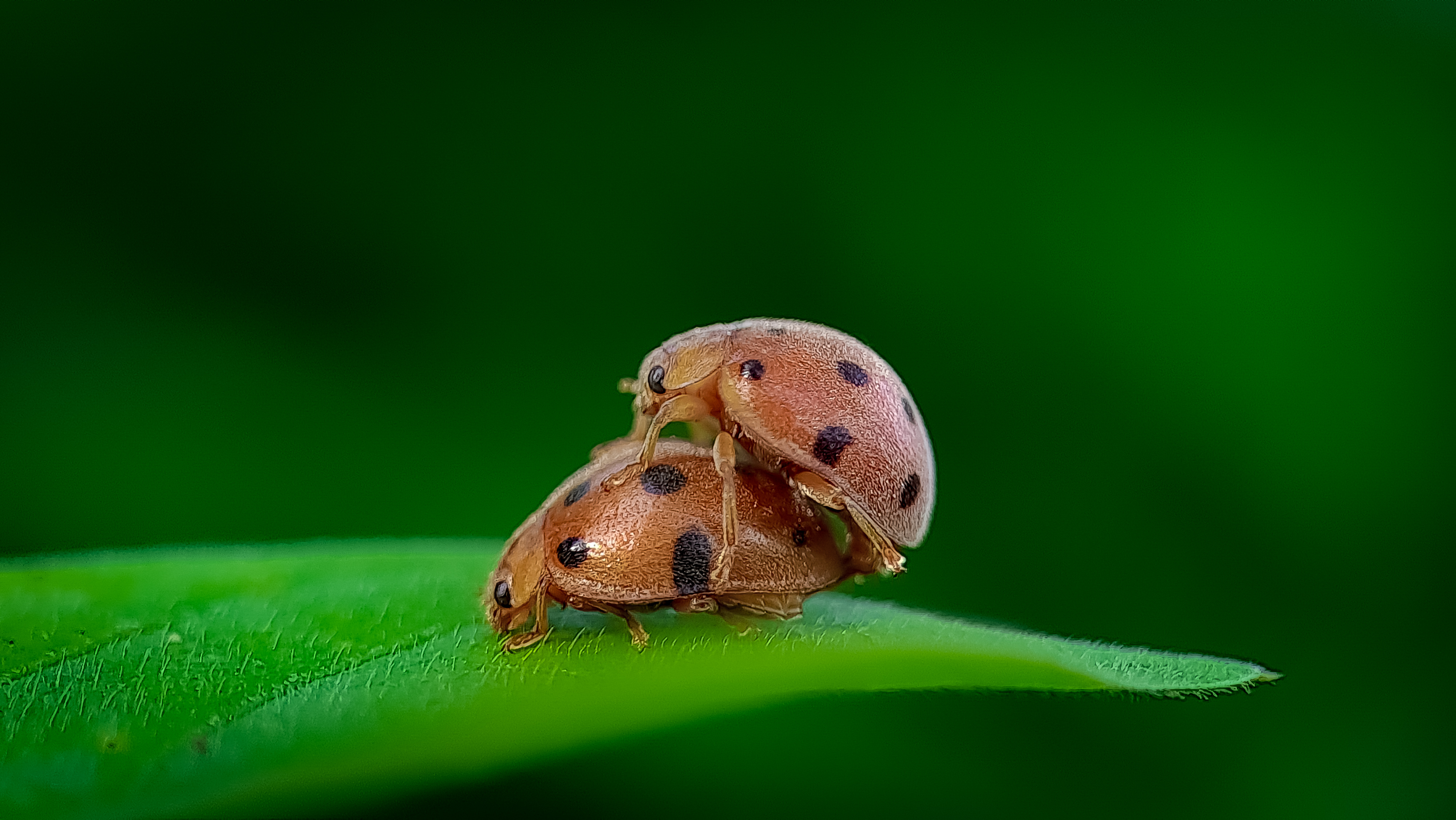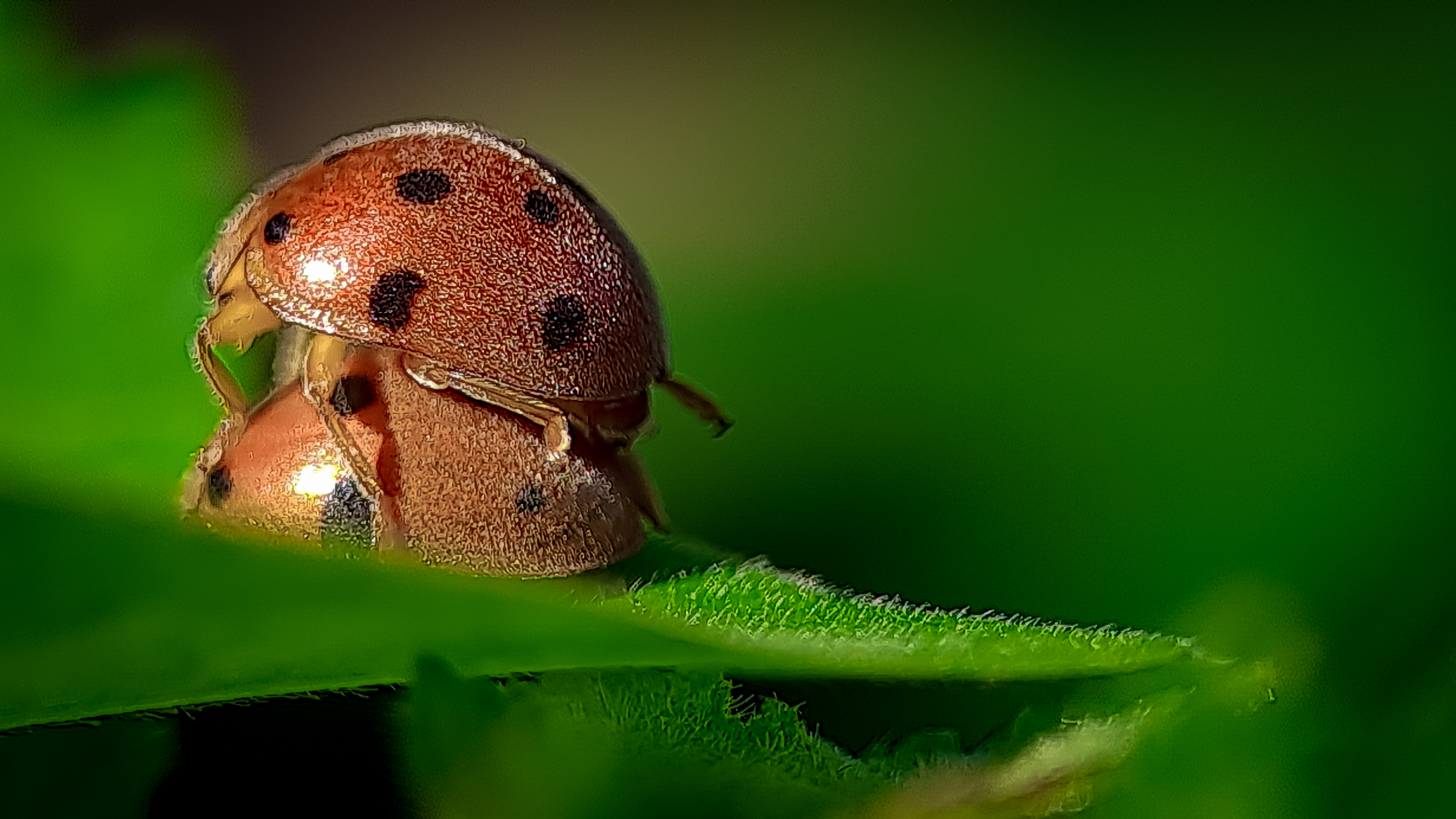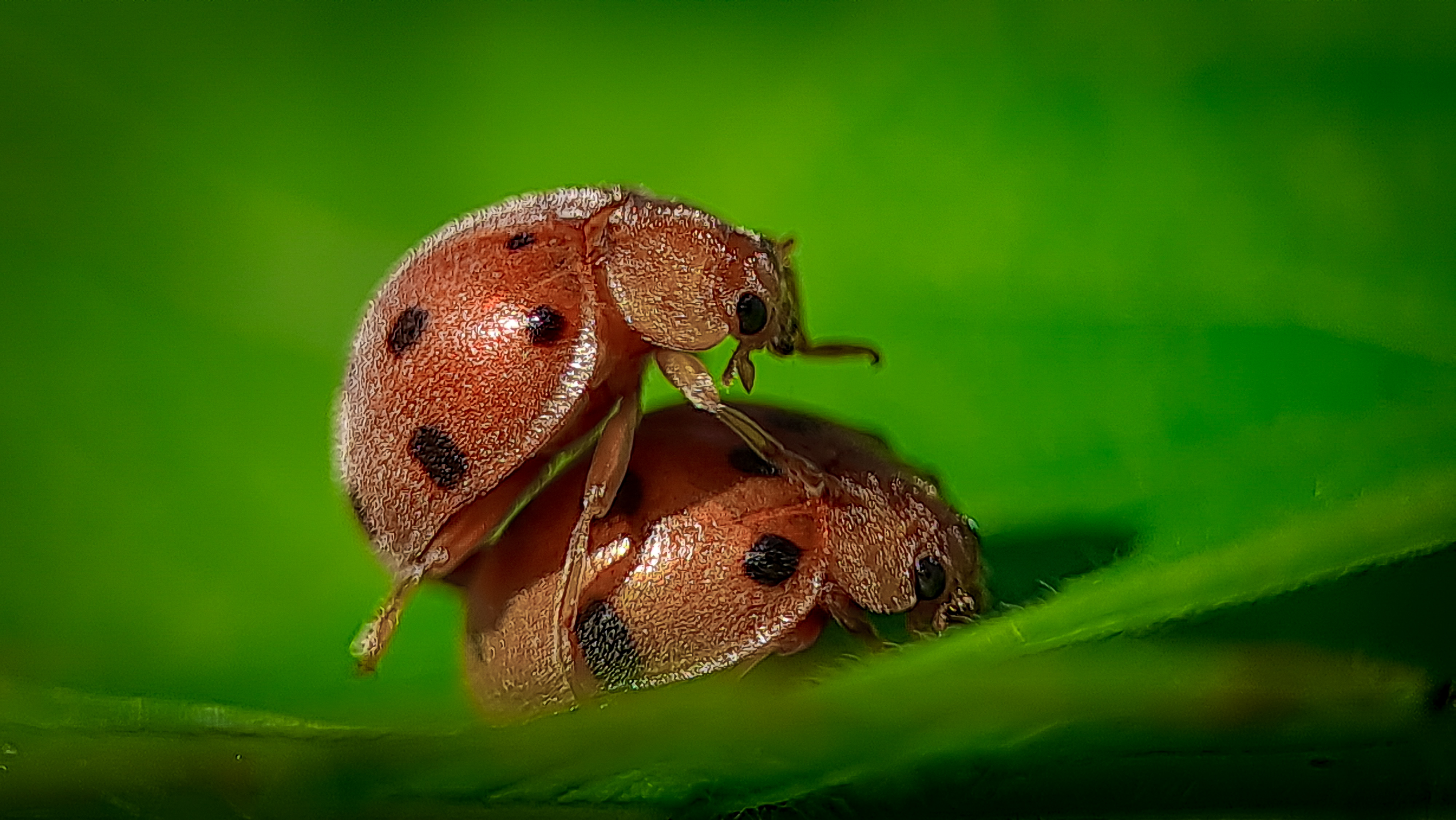 Greetings to all of us who have been in this beloved community, today I am back in front of your eyes to share some of my macrophotography with all of you and the picture that I display on this occasion is a ladybug making love on a leaf and this ladybug I found it a few days ago ago in the forest of Aceh near my house.
