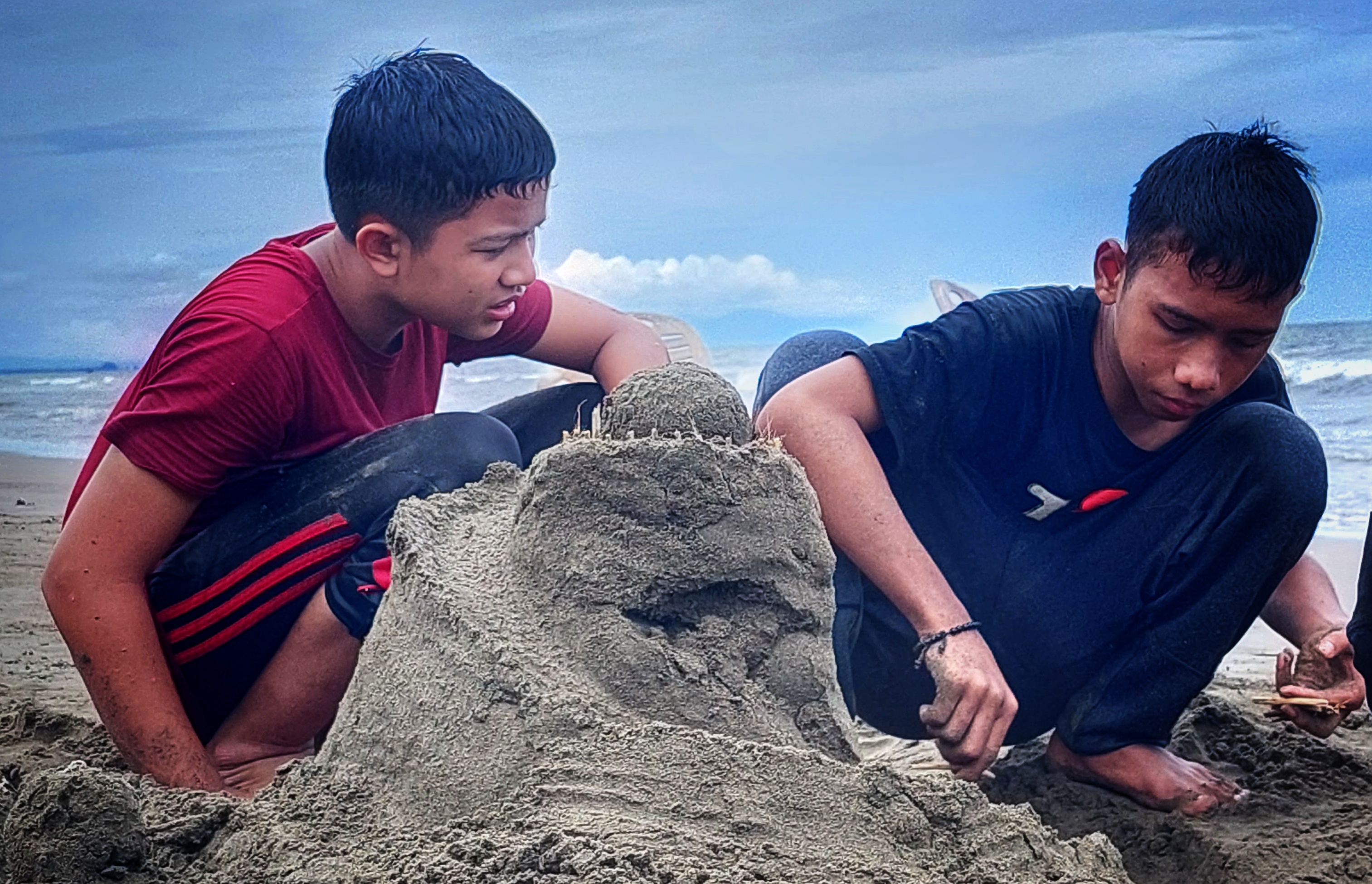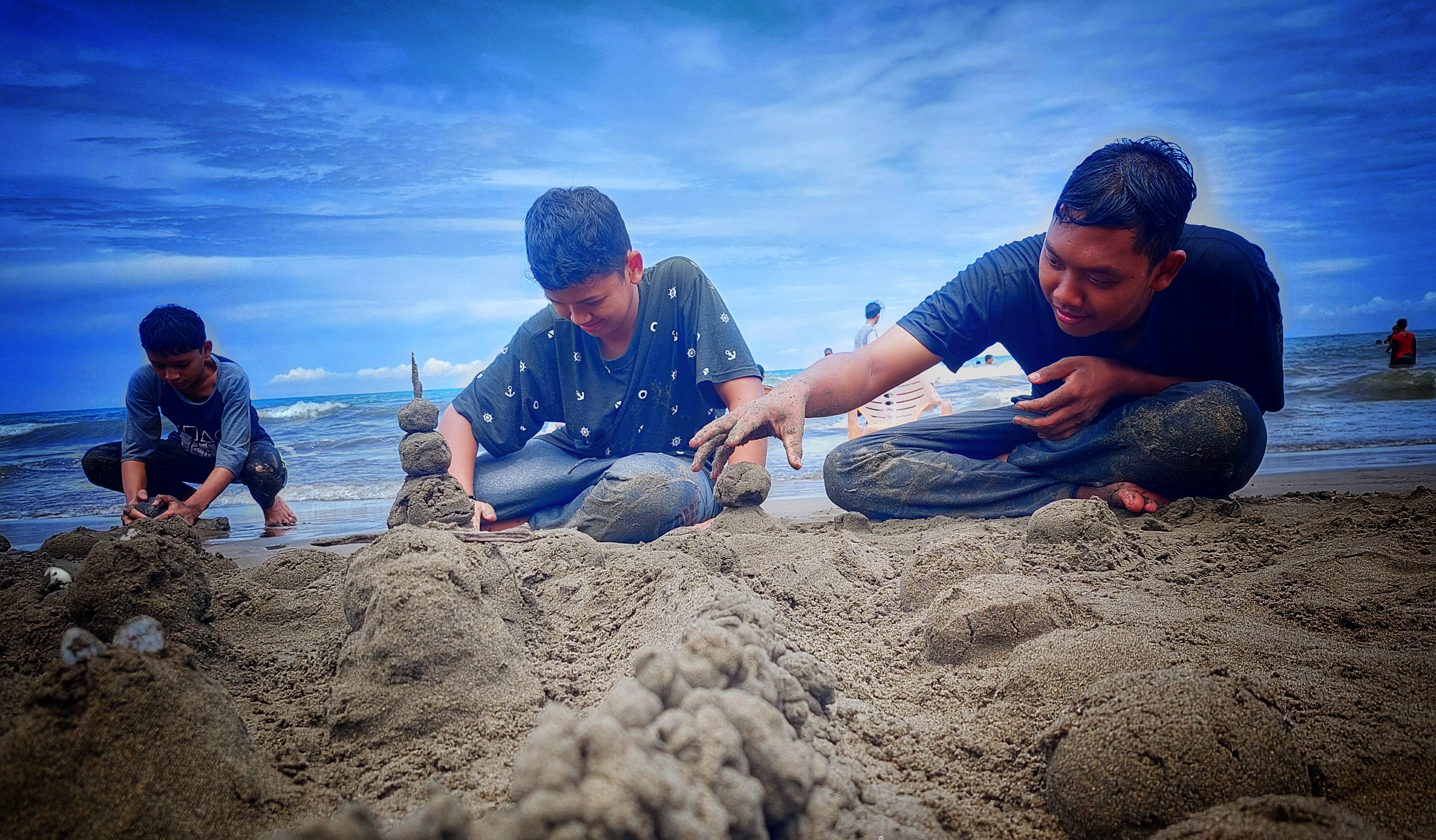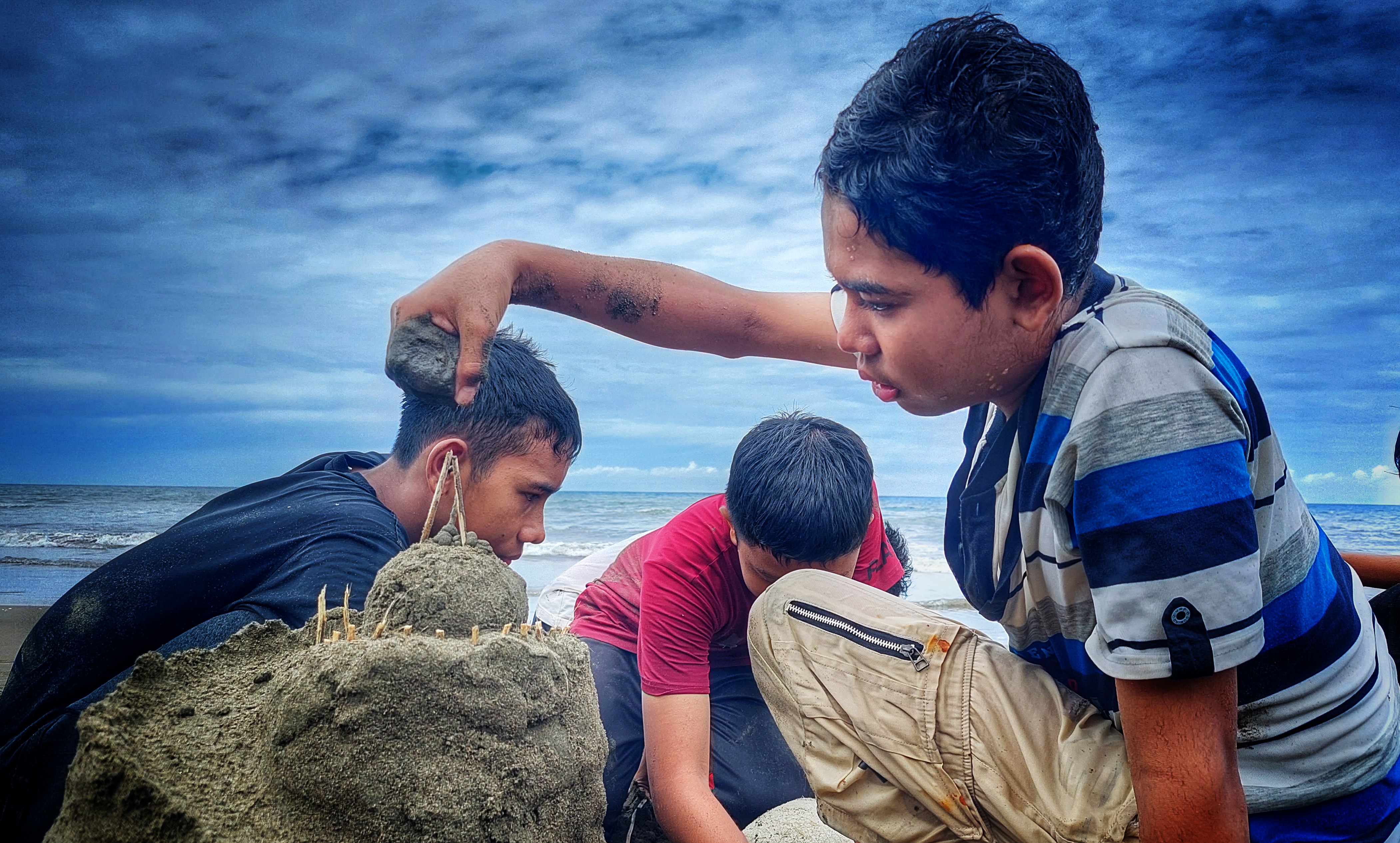 Tangkapan sangat indah yang memperlihatkan kesenangan anak-anak ketika bermain pasir di pantai. Kerja bagus kawan