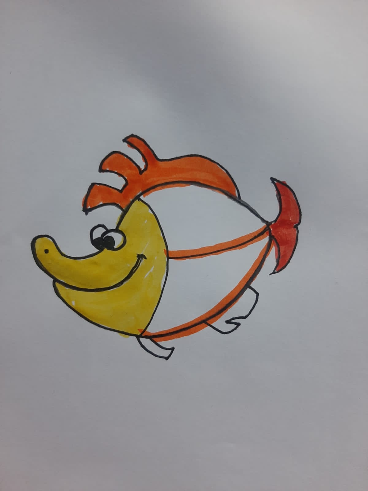 Now we will color the fish. First the eyeballs should be blackened and the head and lips should be painted yellow. Then the fins and tail should be painted orange.