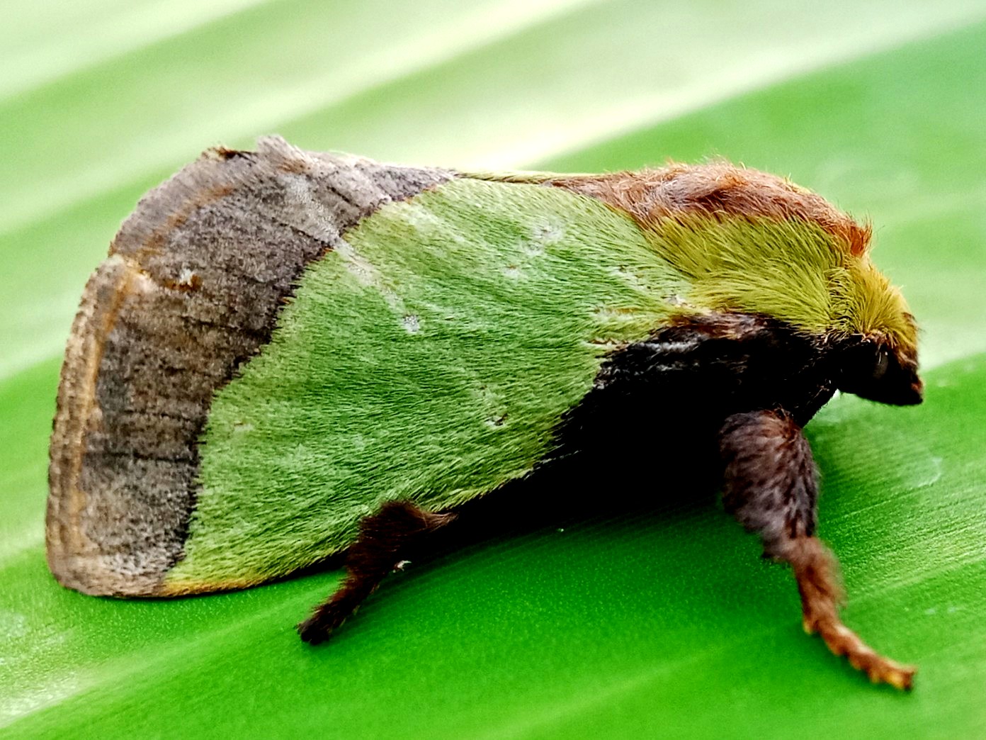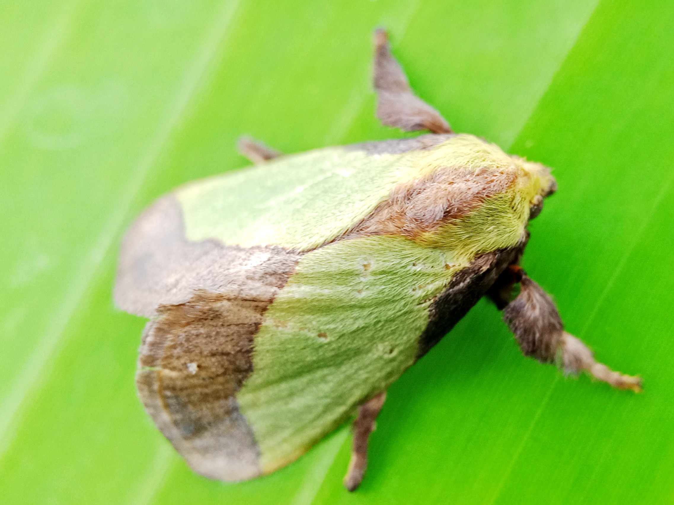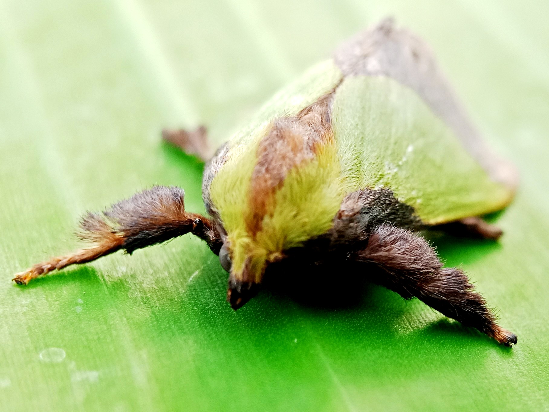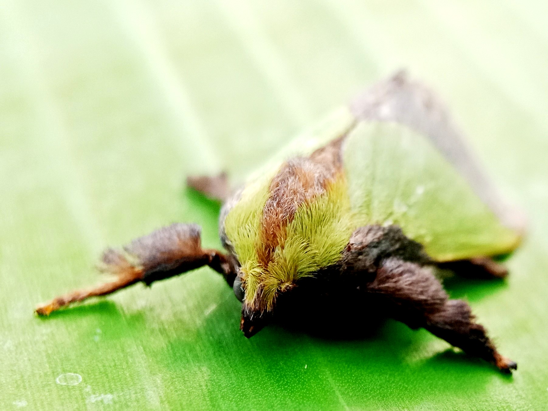 In my opinion, this is a moth that has some very beautiful colors and the characteristic color of this insect is a green color like the color of the banana leaf on which it sits.
