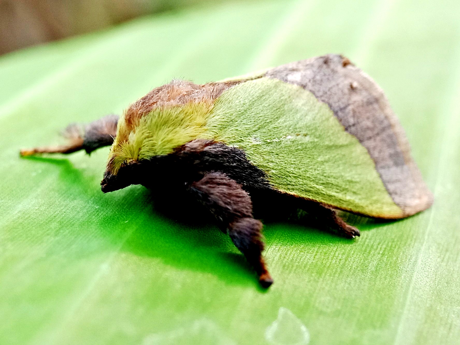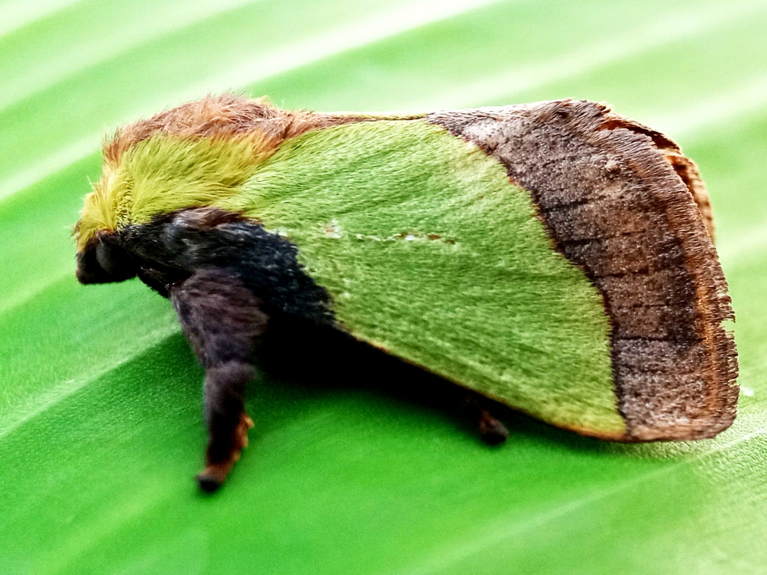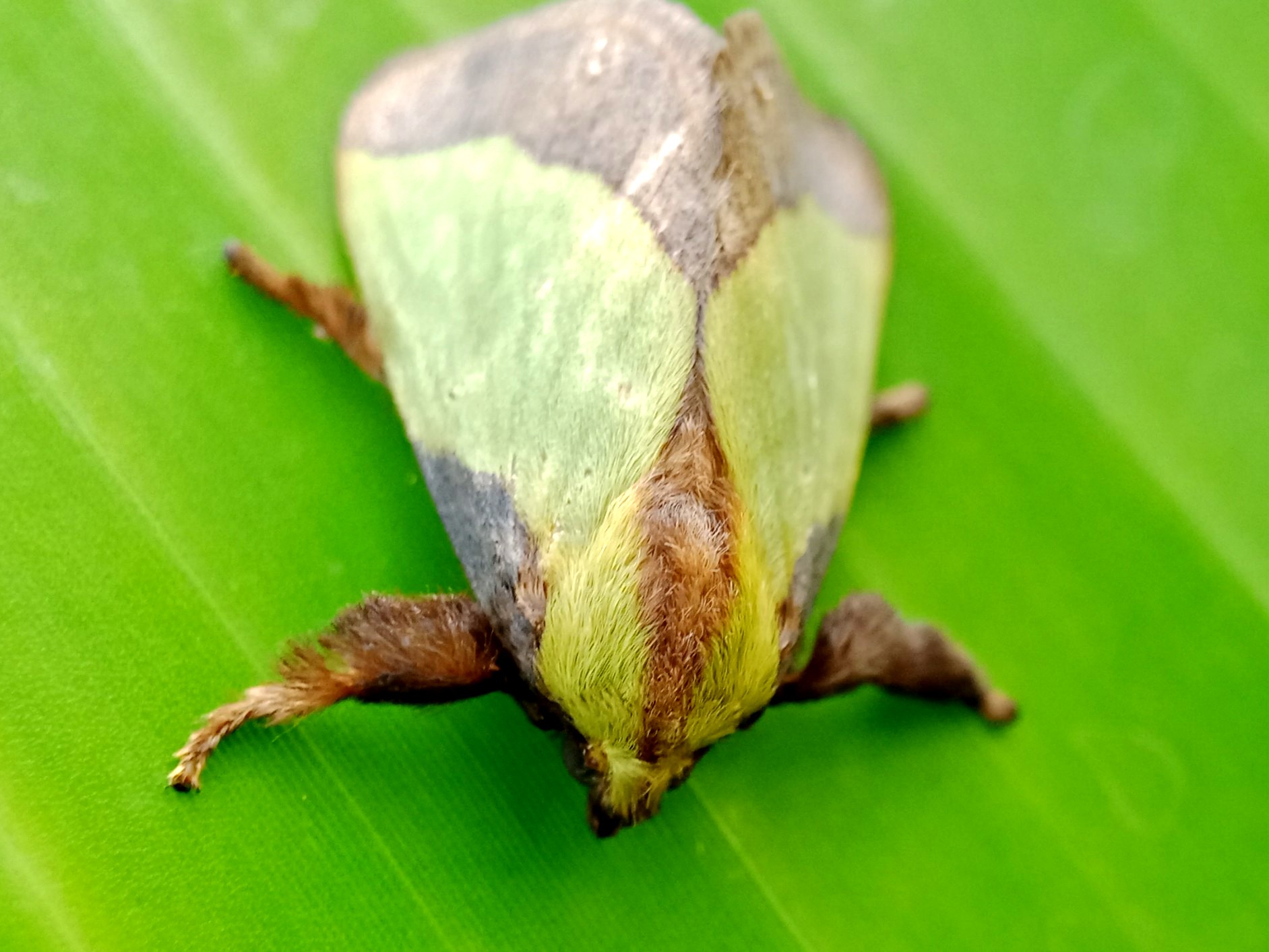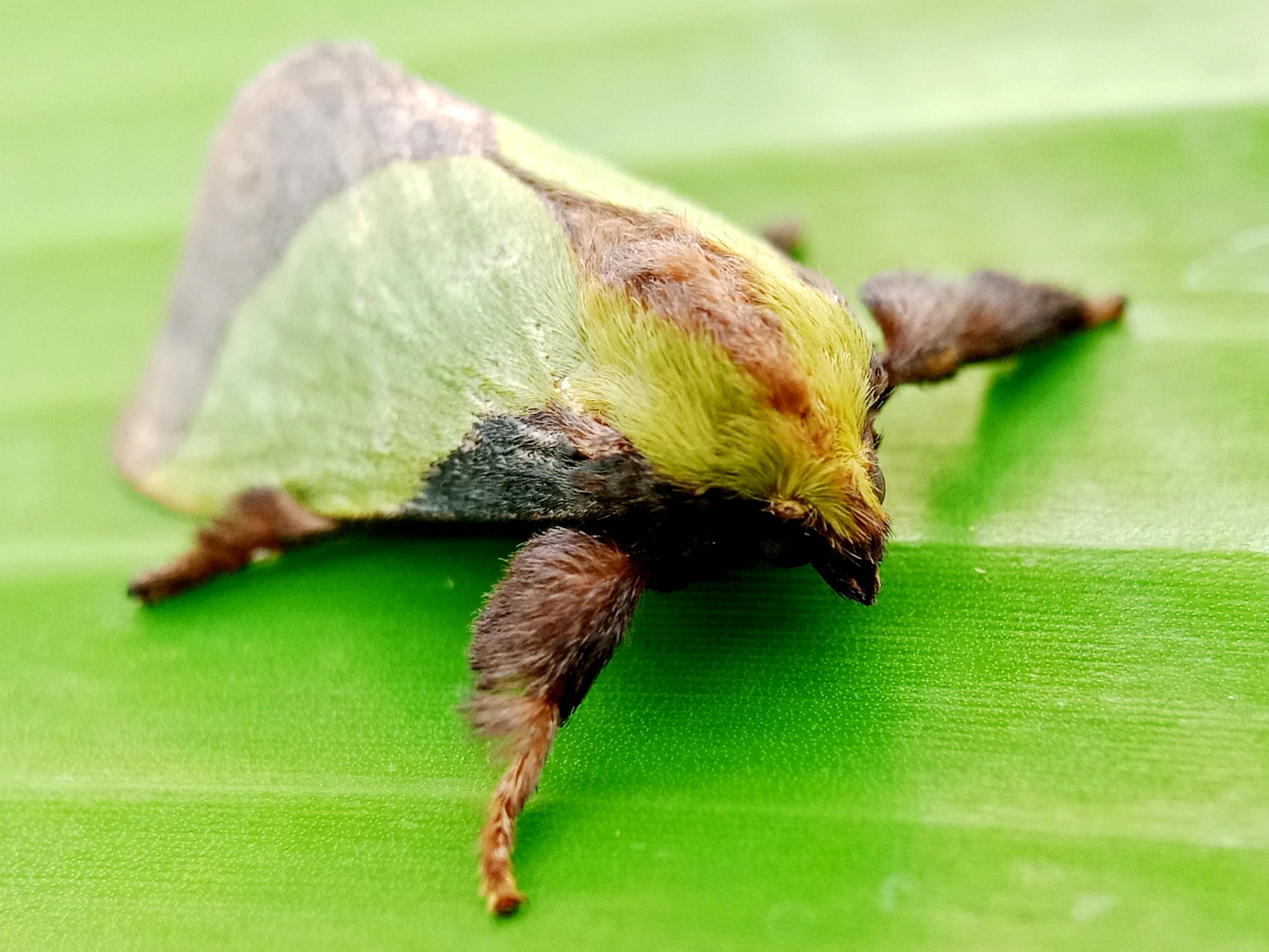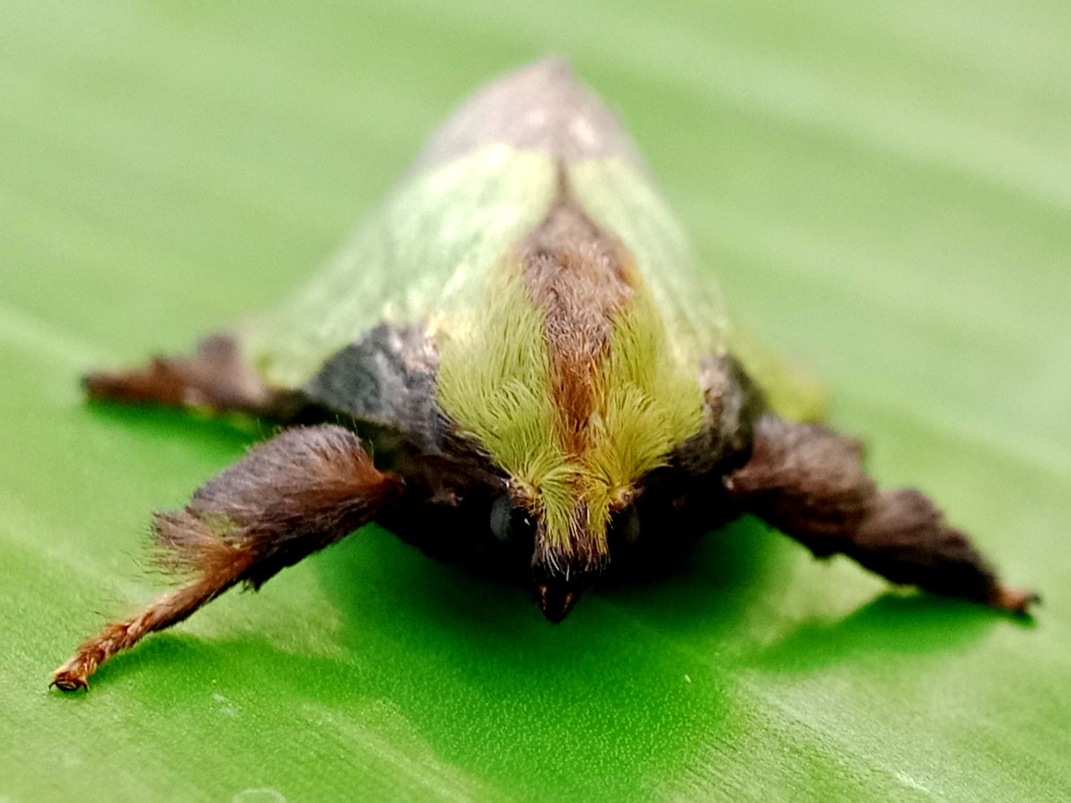 In my opinion, this is a moth that has some very beautiful colors and the characteristic color of this insect is a green color like the color of the banana leaf on which it sits.