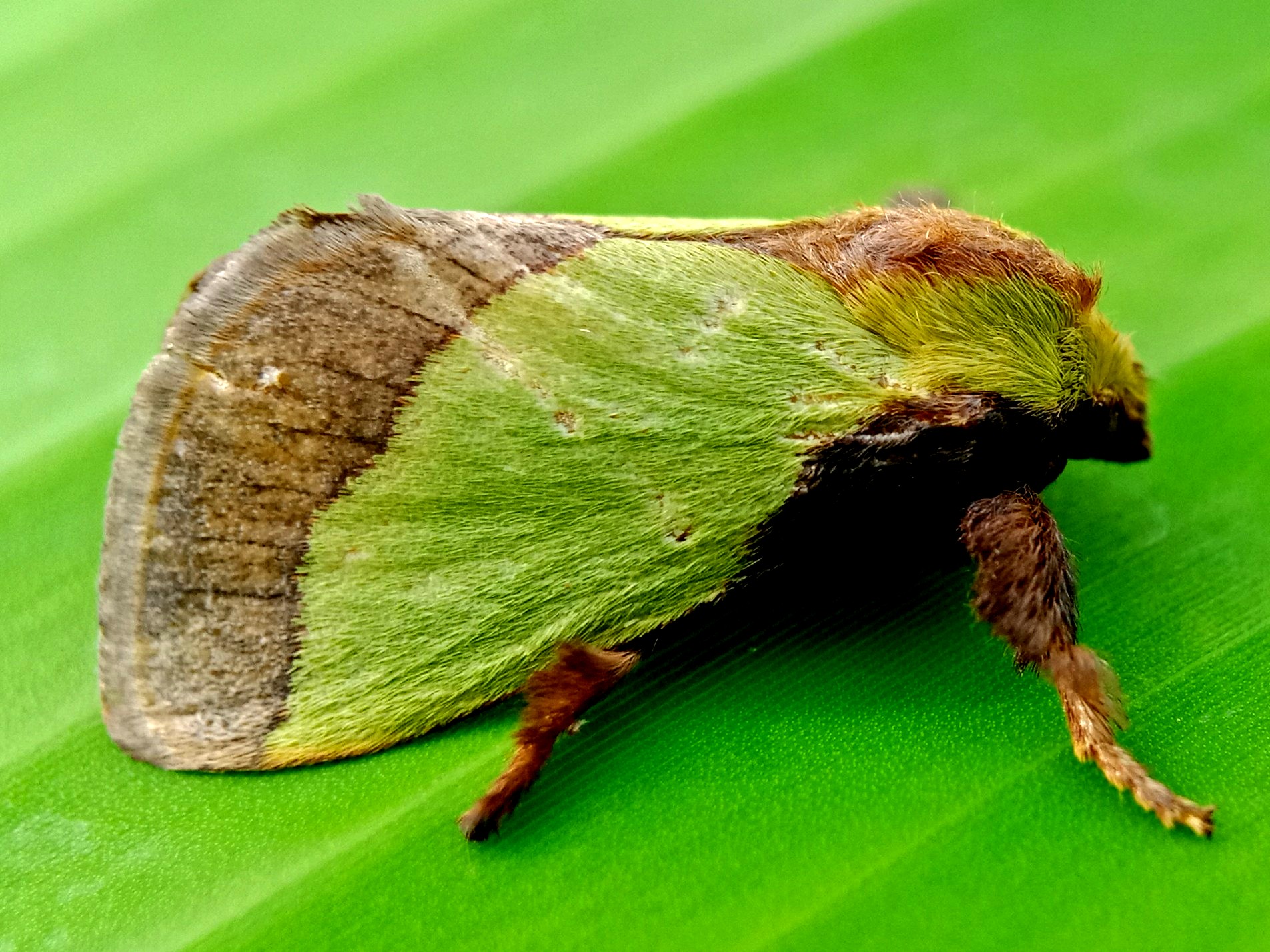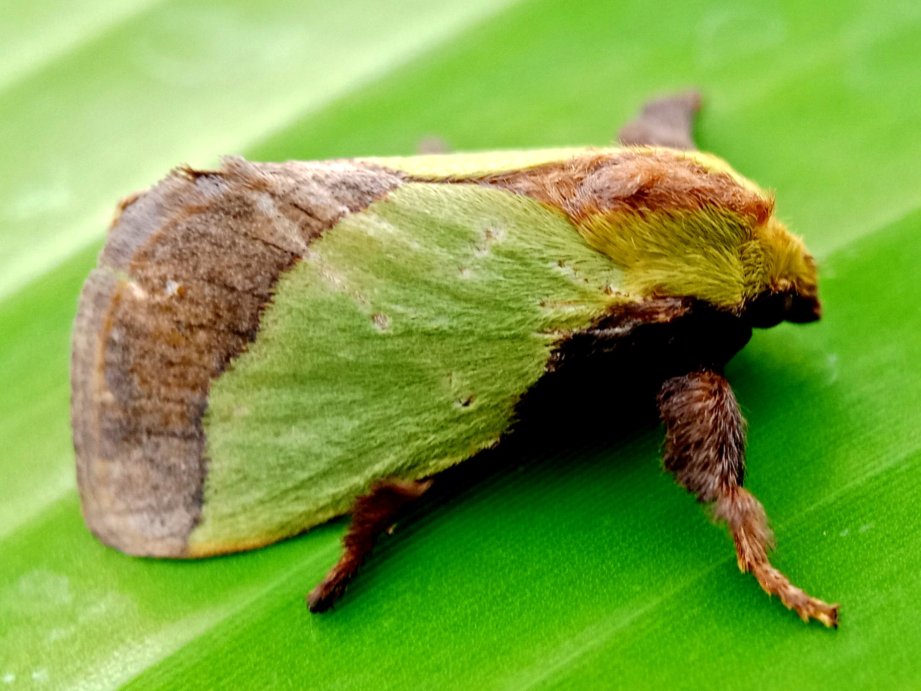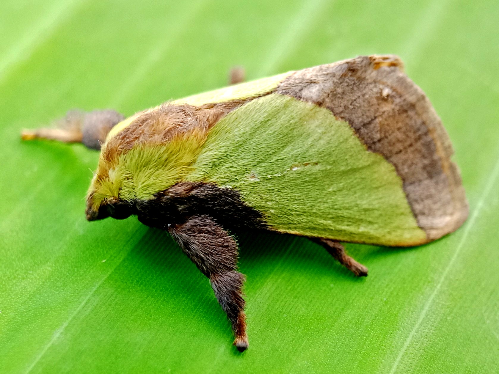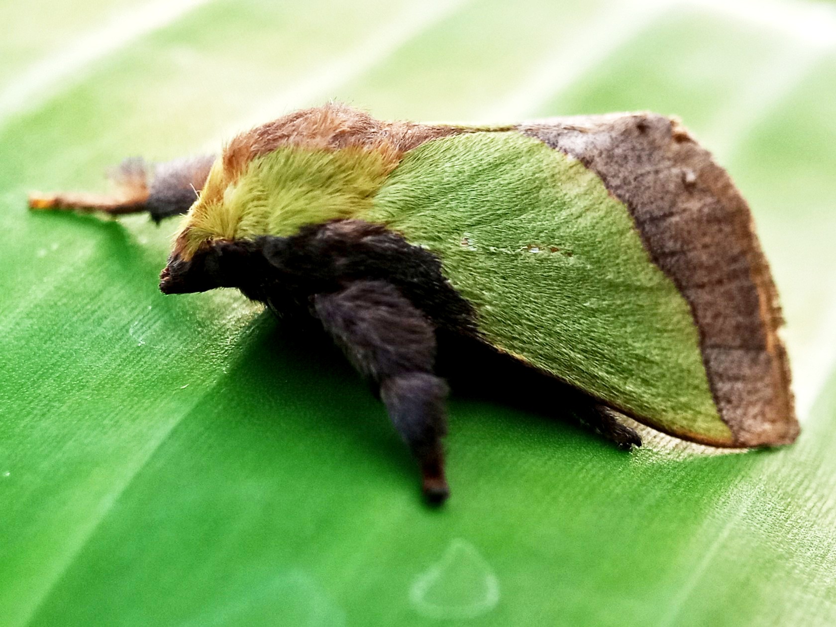 In my opinion, this is a moth that has some very beautiful colors and the characteristic color of this insect is a green color like the color of the banana leaf on which it sits.