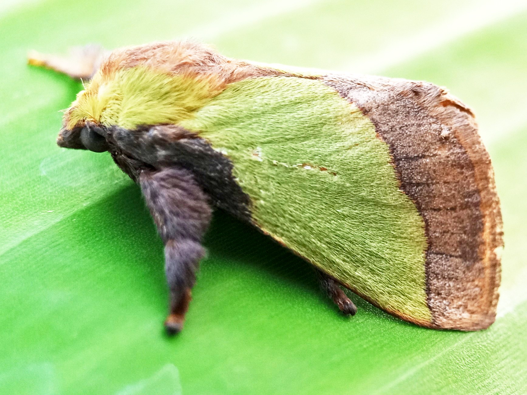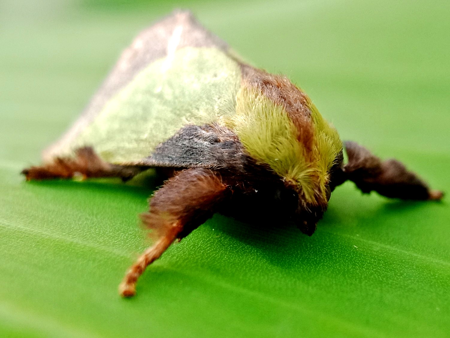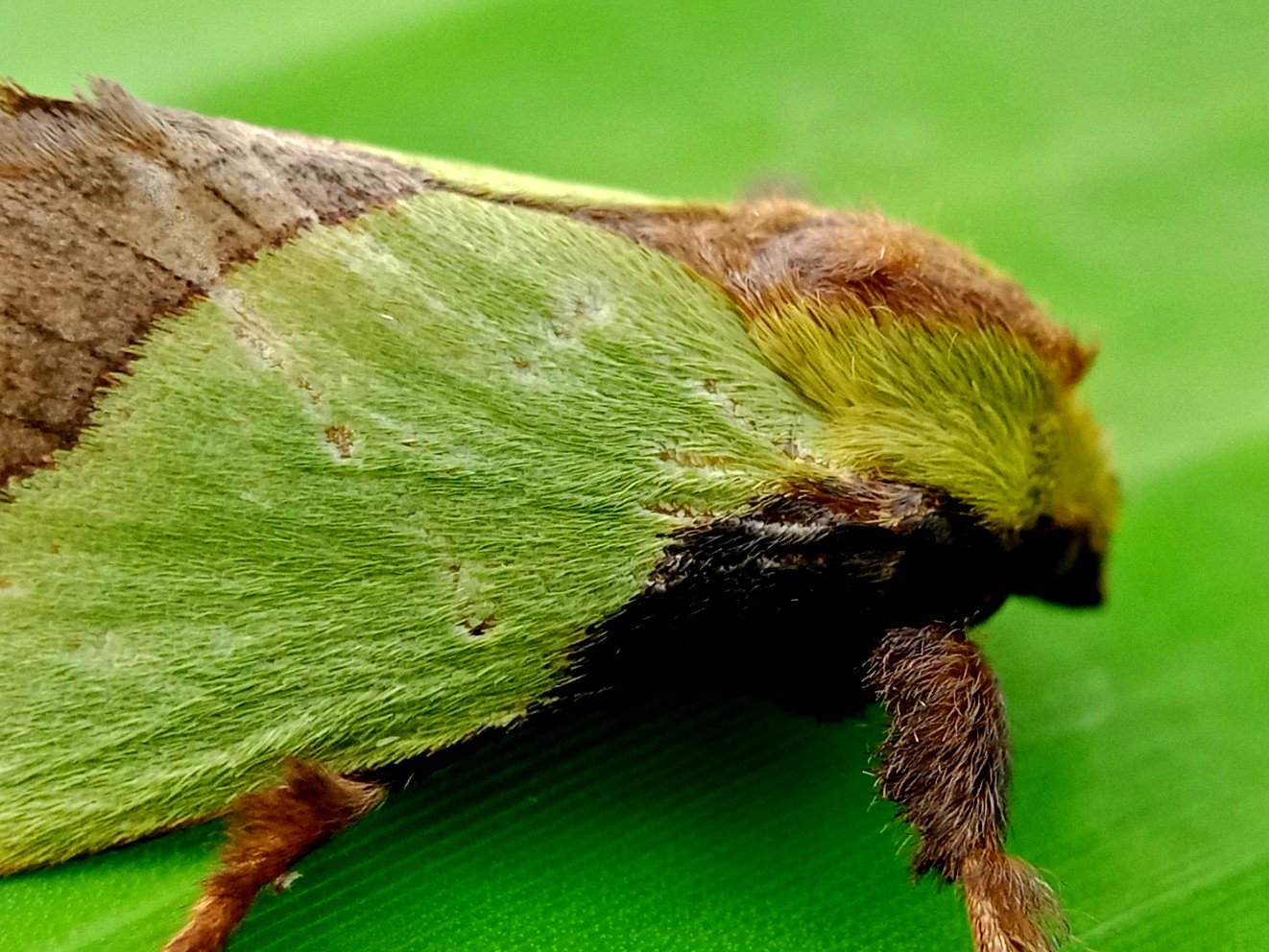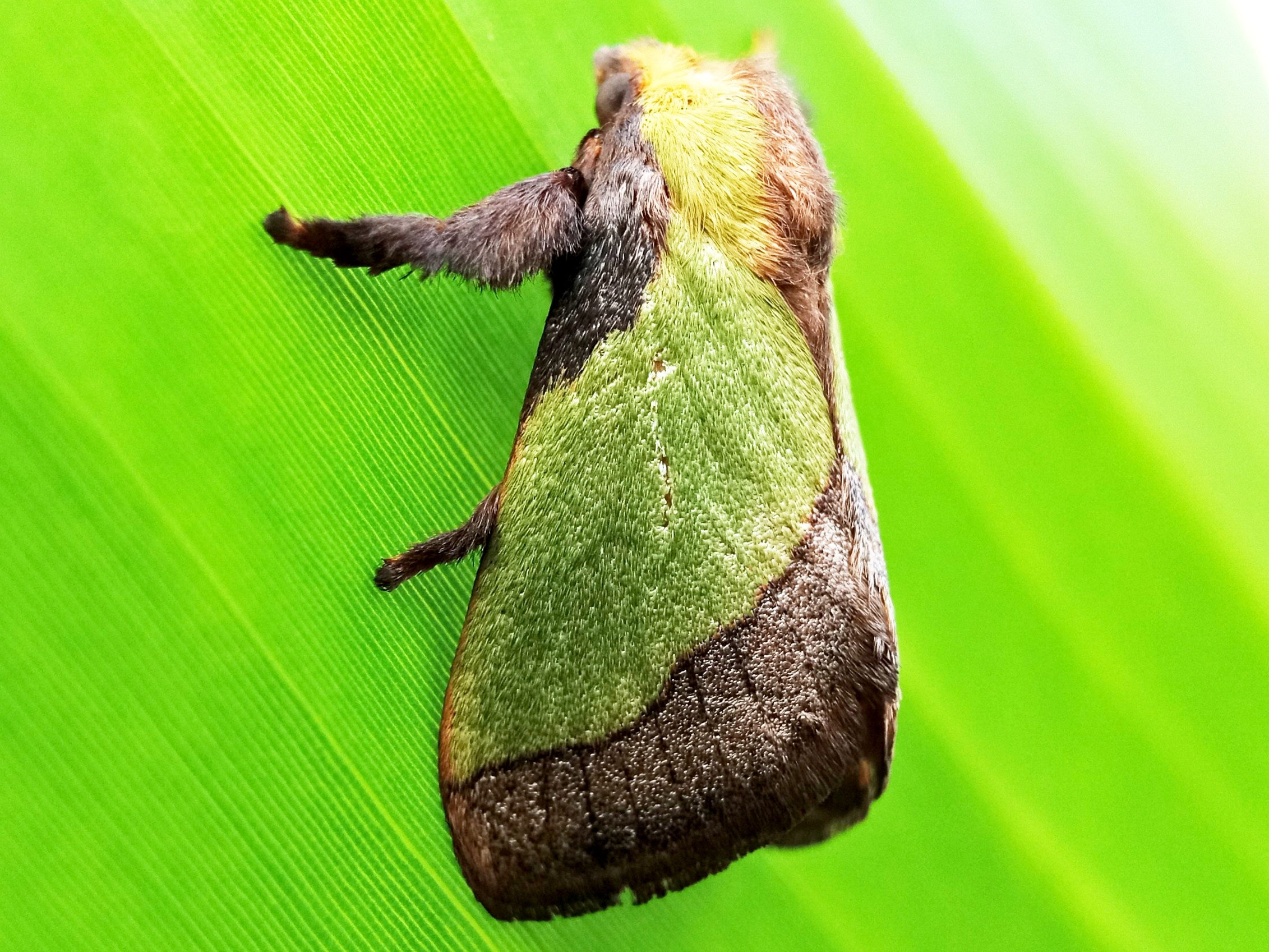 In my opinion, this is a moth that has some very beautiful colors and the characteristic color of this insect is a green color like the color of the banana leaf on which it sits.
