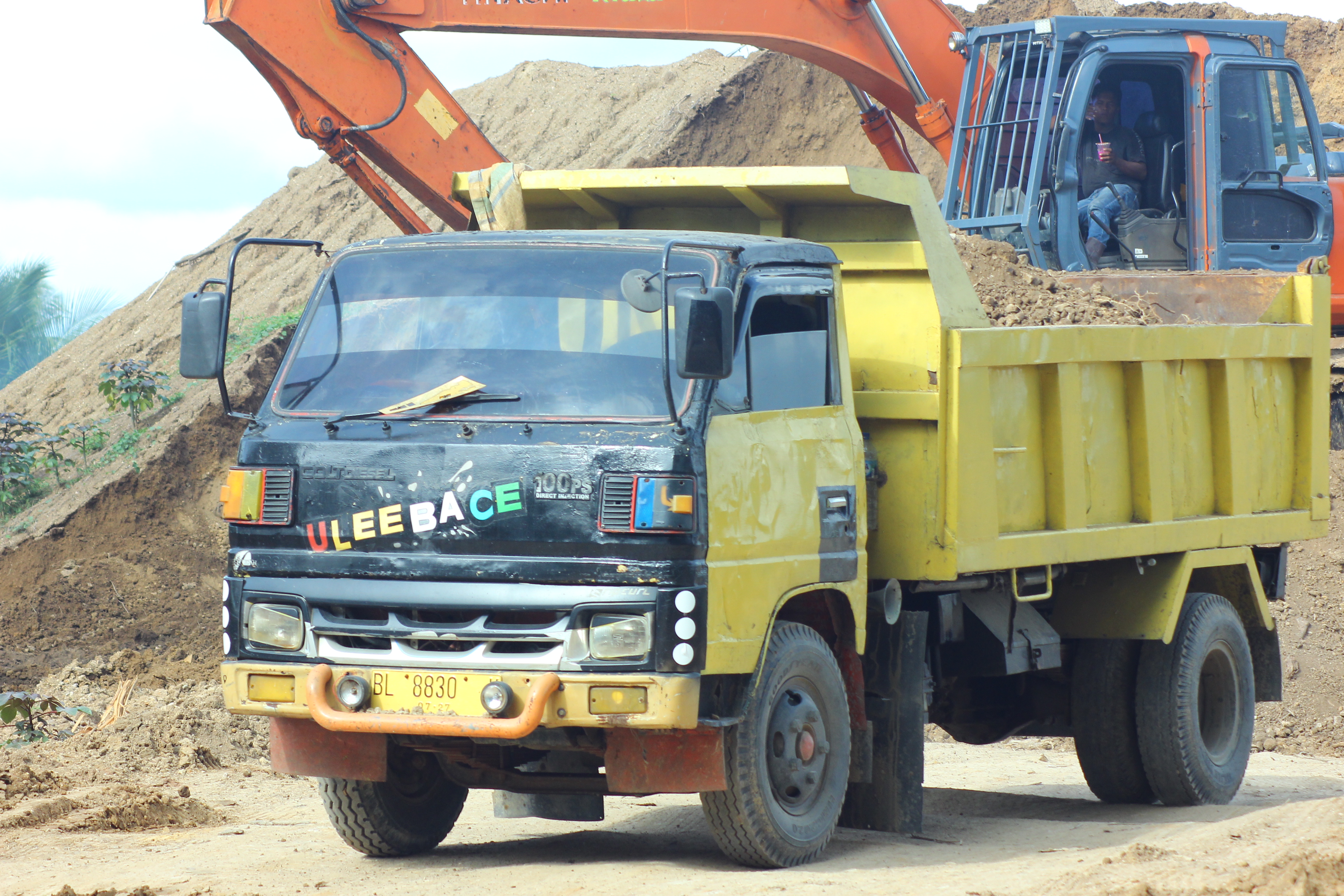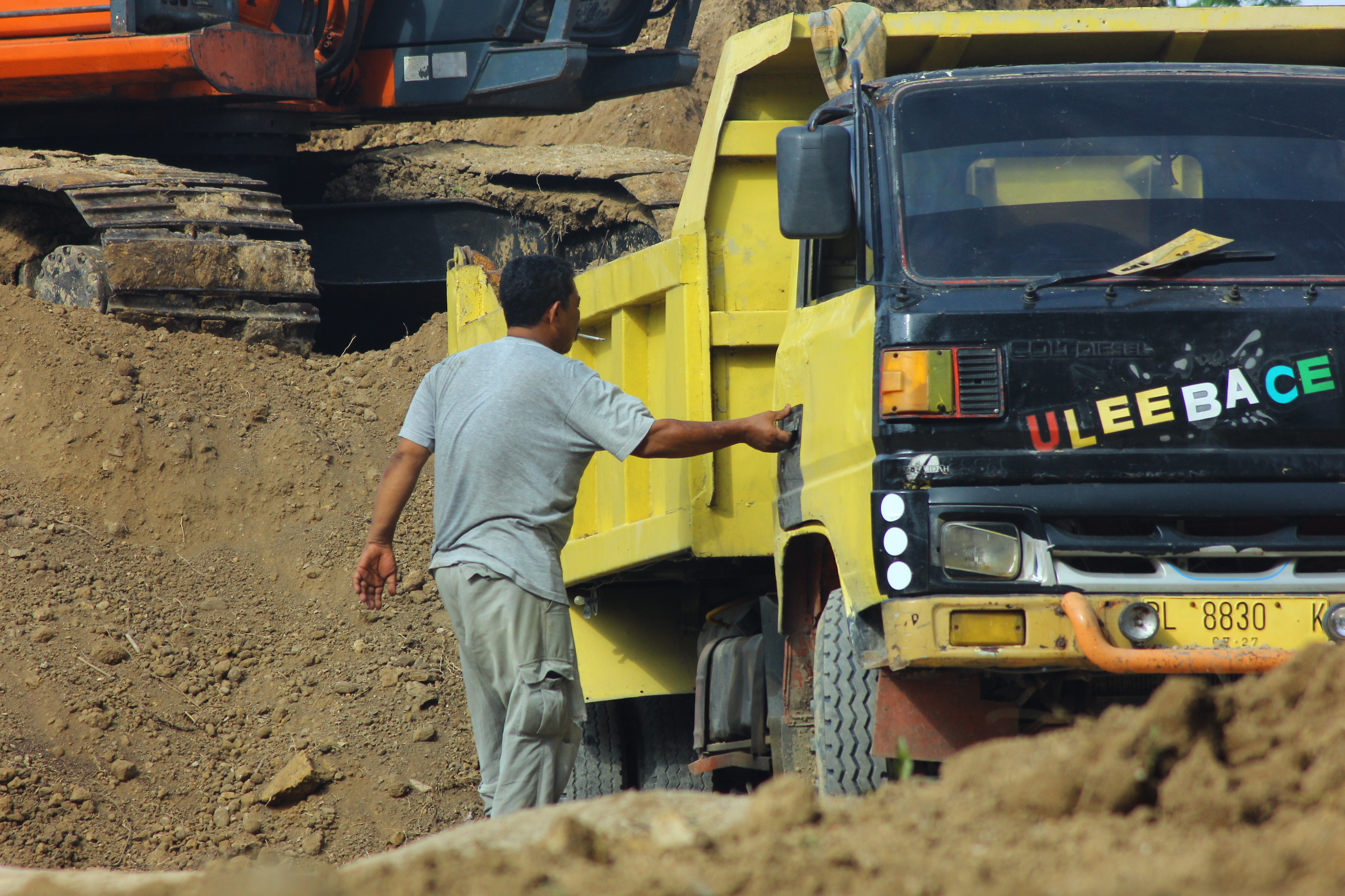Hello beloved friends, best wishes to all of us who are here and hopefully we are all always in good health and well. On this happy occasion I would like to show you again an interesting image that I have prepared. When there is a project in a rural area, of course there are activities from youth. In our village there is a project to move soil from digging a canal which has piled up quite high and will be thrown to another place so that it doesn't become a hill. Enter heavy equipment, namely bekos and also cars and trucks that transport land to that location to be moved to another place.