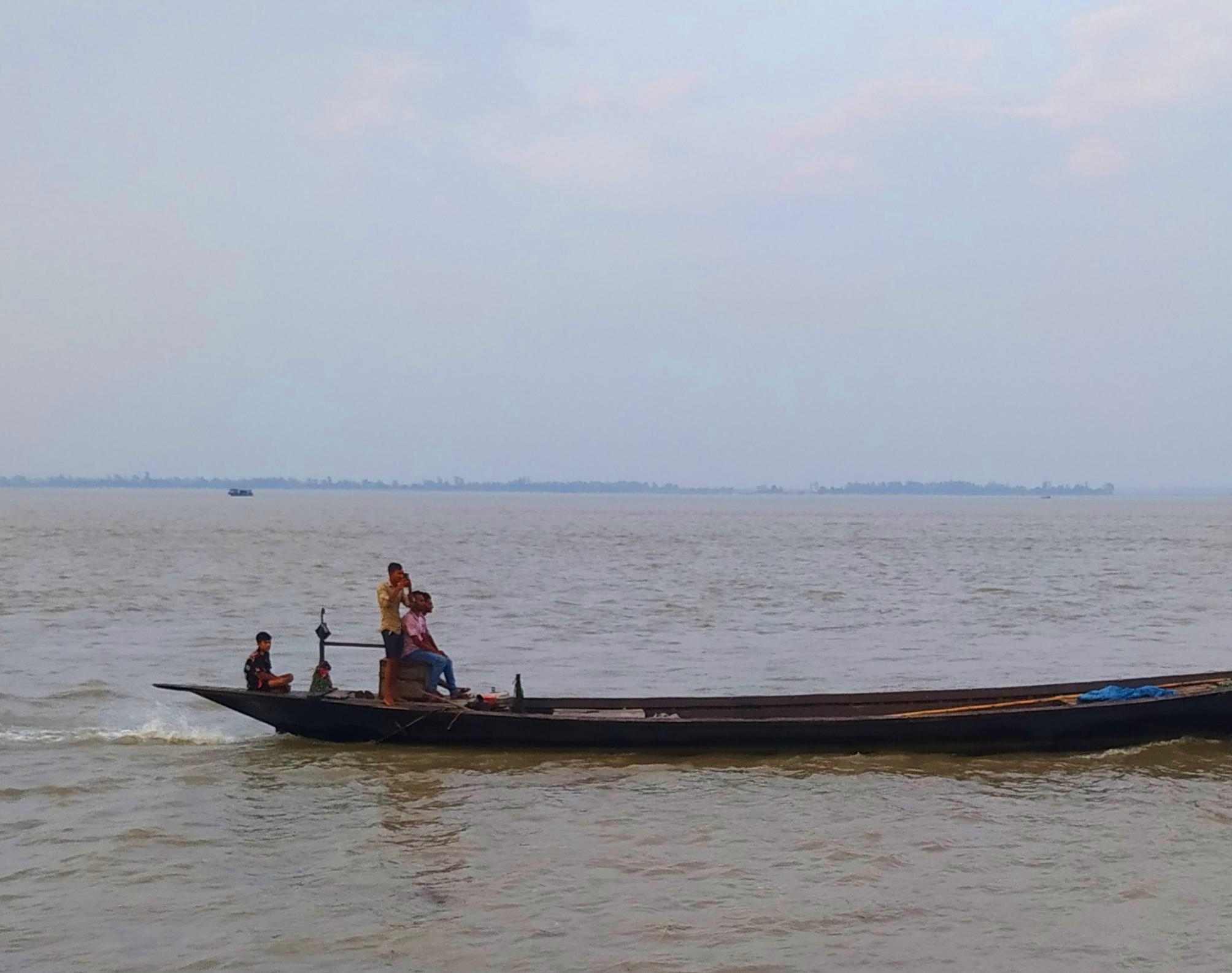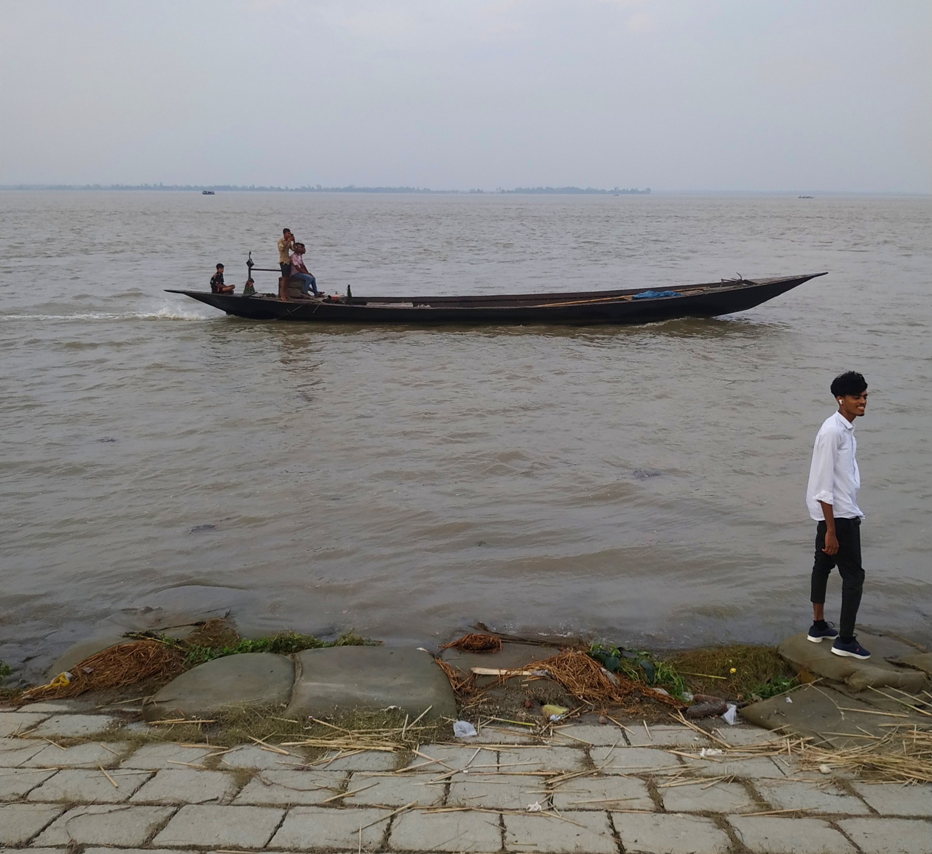 As the day fades and the sky begins its soft descent into twilight, the riverside transforms into a living painting. The soft glow of the evening sun filters through scattered clouds, casting golden hues across the wide waters. In one frame, a long wooden boat slices gently through the river, carrying a handful of passengers perhaps local villagers, maybe a family out for a ride. The ripples in the water tell their own story, whispering the tales of generations that have sailed these waters.