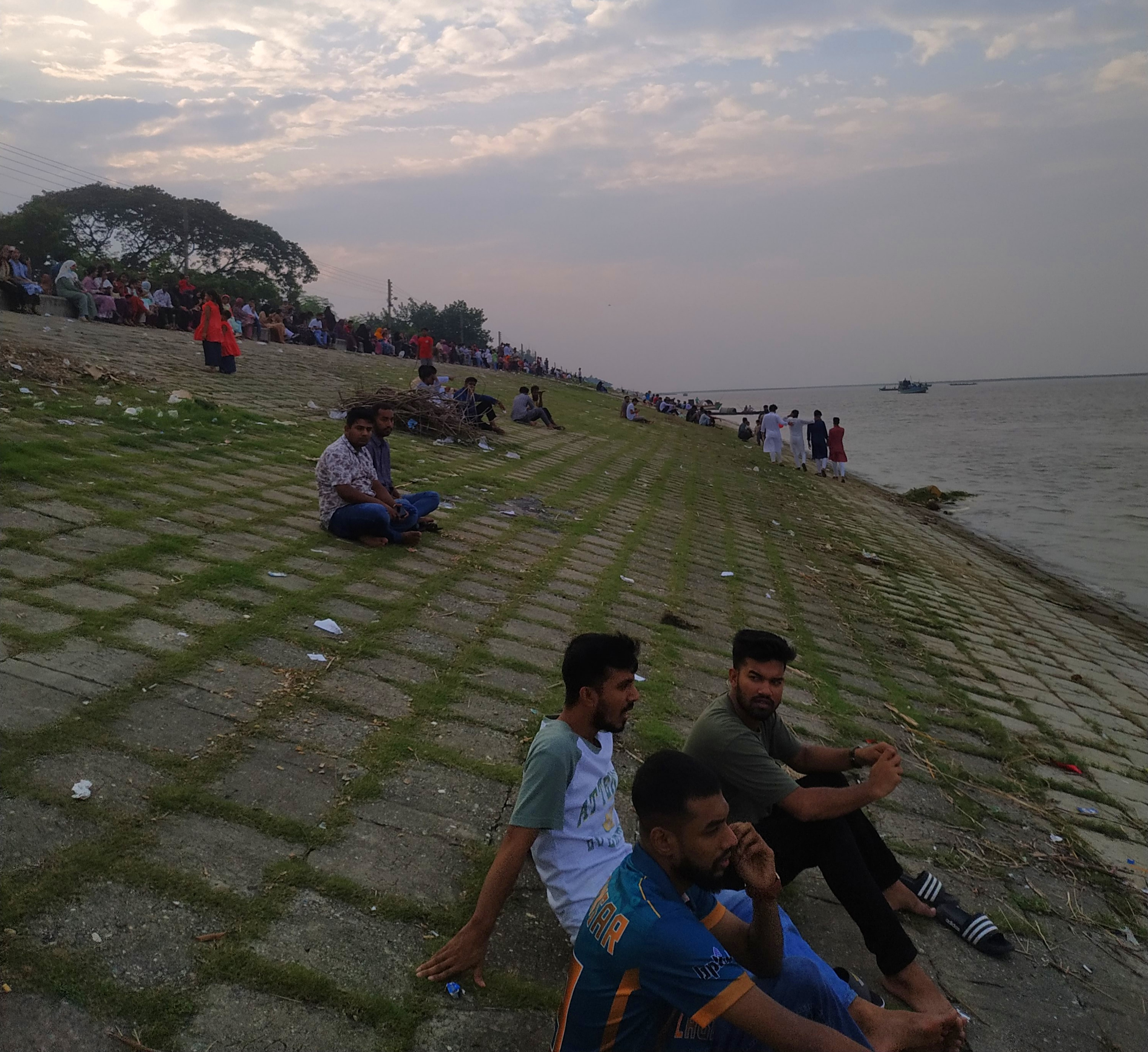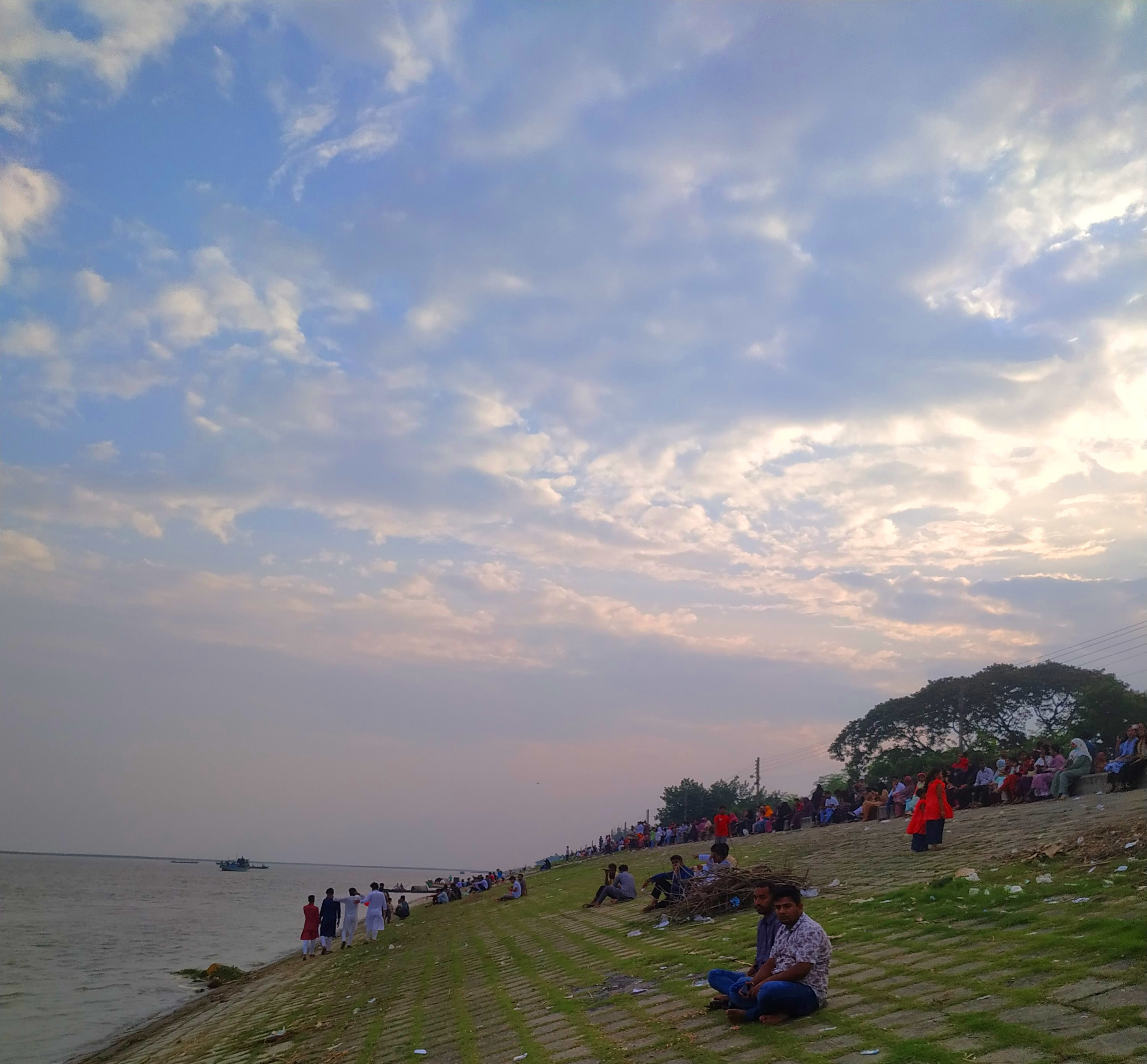 The most striking part, however, is the crowd. Rows upon rows of people families, couples, friends,sit together, facing the water, as if in collective meditation. Elderly men in white panjabis, young women draped in bright-colored veils, children hopping along the stone steps. It's a mosaic of human life, bound together by the simple joy of being near the water.